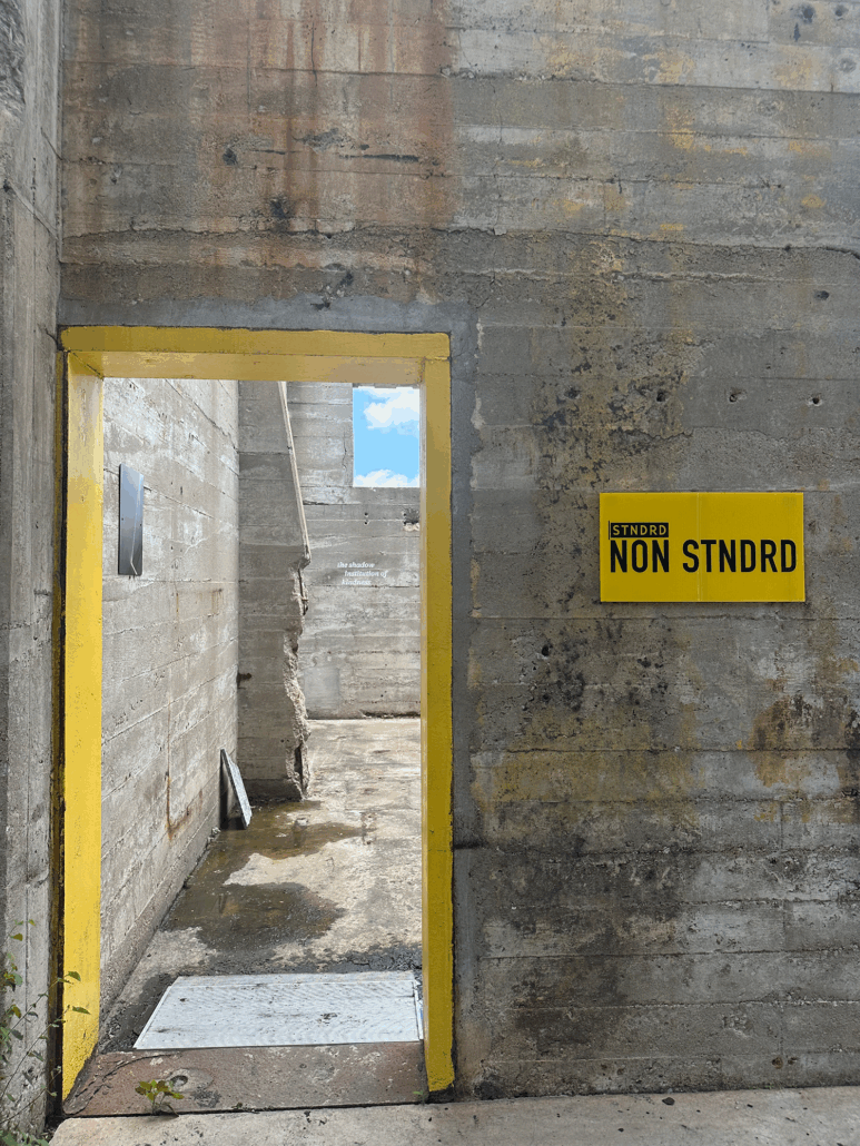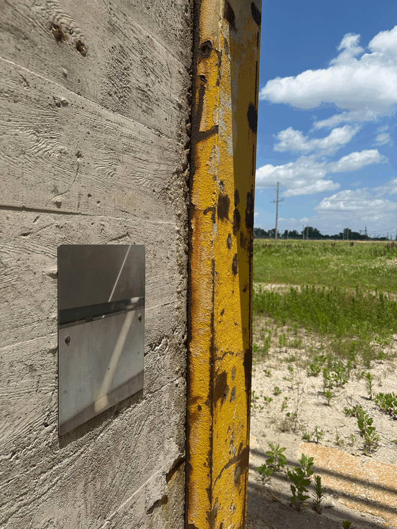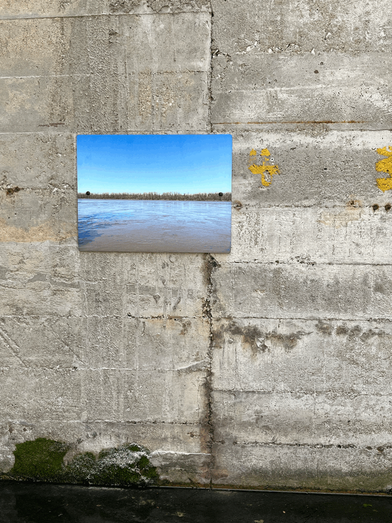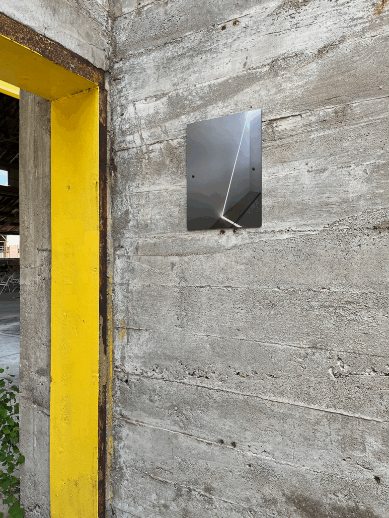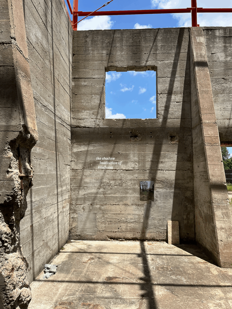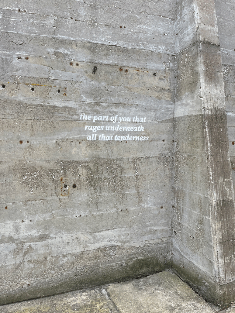 a different, better self was a site responsive installation for NONSTNDRD, featuring photographs and text from my series The Parts combined with materials borrowed from the National Building Arts Center. The installation is a loose reflection on the passage of time over the course of a day (the movement of light), the season (the movement of water), and a lifetime (the movement of emotional memory). a different, better self features two sets of photographs printed on reflective aluminum: three images of the Missouri landscape (one urban, one suburban, one rural) shot during the locked-down spring of 2020, and three images of a beam of light moving through the architecture of the Pulitzer Arts Foundation, where I had a solo exhibition in 2021. The featured text, applied directly to the bunker in spray chalk (a temporary and changeable medium designed to erode over time), questions the role of empathy as a central lens of understanding, highlighting implicit challenges in the mandate to love: one wall reads “the shadow institution of kindness,” and the other “the part of you that rages underneath all that tenderness.” The exhibition’s title is also drawn from The Parts: an excerpt of the statement, “In isolation, you imagine you might be able to become a different, better self: someone who gardens, someone who’s calm.”
