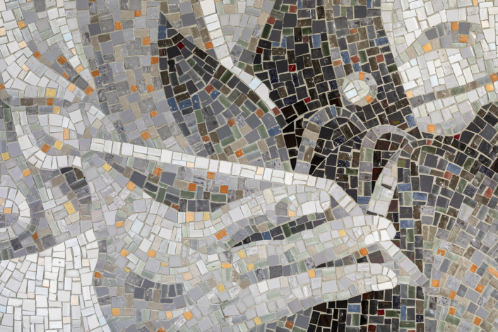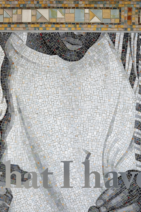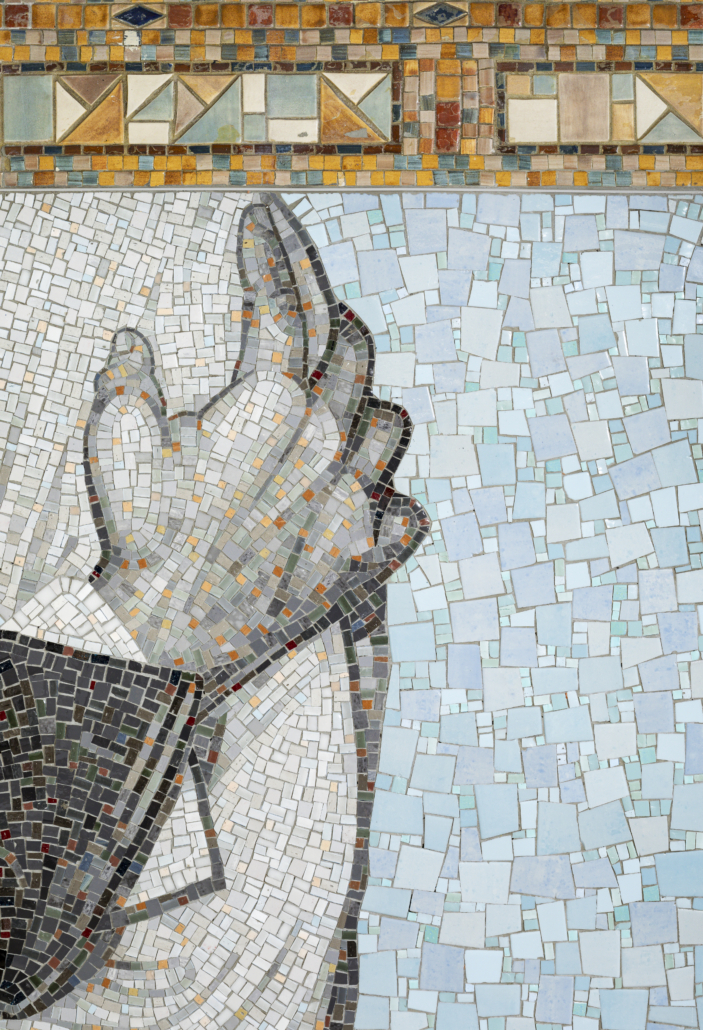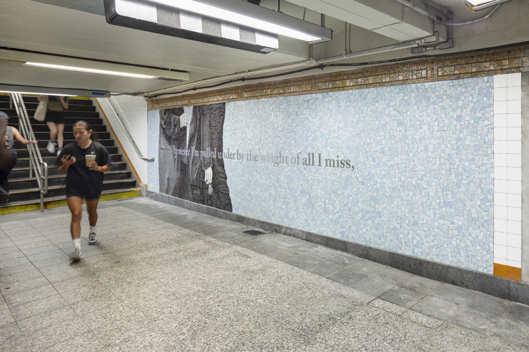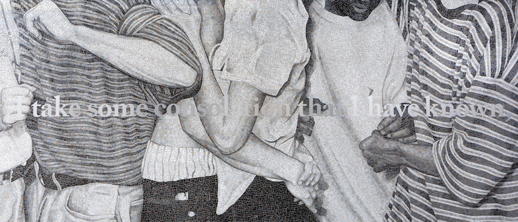 Fabricated by Miotto Mosaic Art Studios, the three compositions portray various gestures of touch overlaid with text I wrote, lending a sense of continuity across each wall. The text, rendered in cut metal lettering, reads: “Whenever I’m pulled under by the weight of all I miss, I take some consolation that I have known, and may yet know, another life.” Spreading as a single sentence over the three mosaic panels encourages the work to be read like an open book, with one panel serving as the front cover, another as the central spine, and the third as the back.