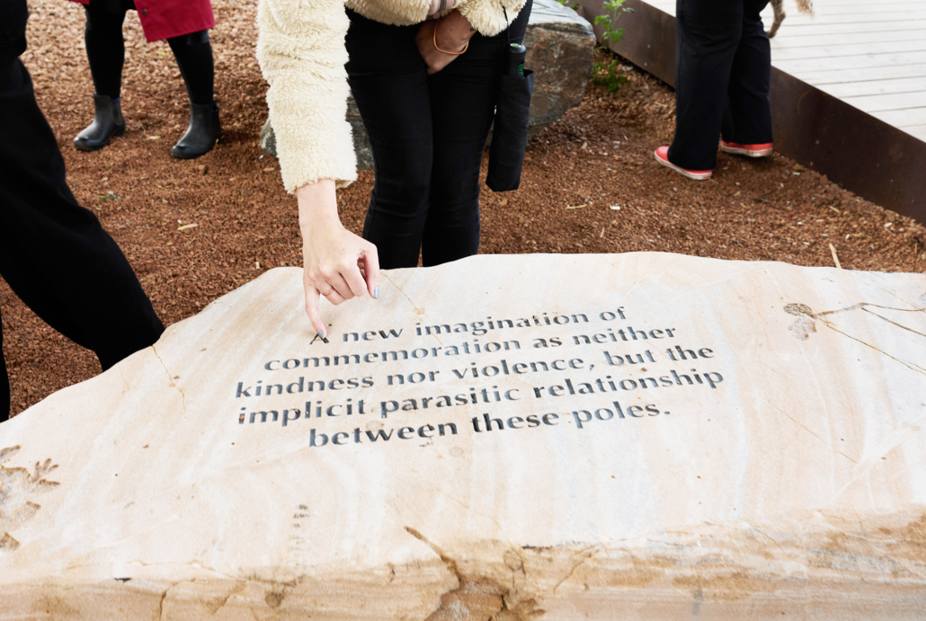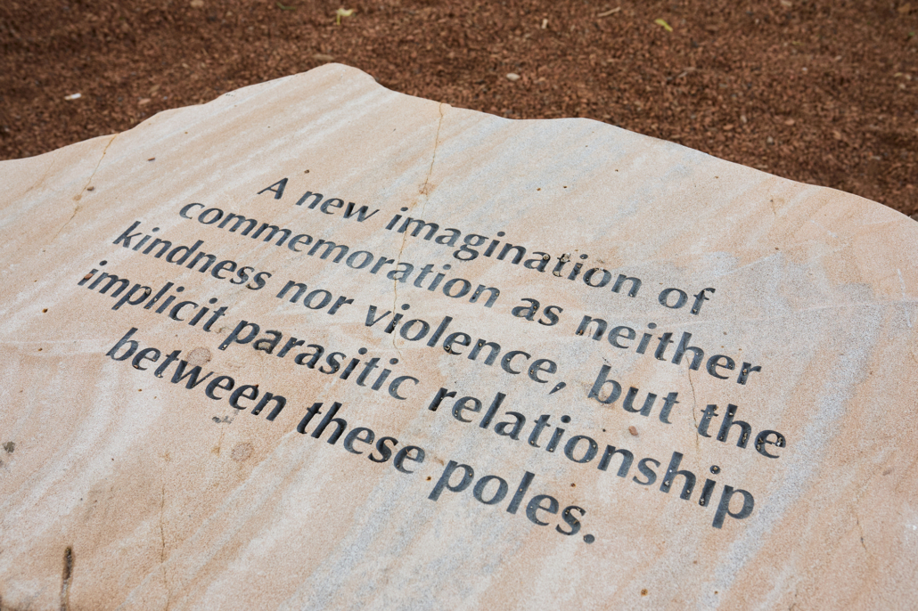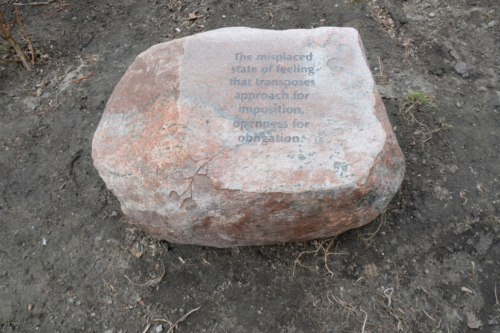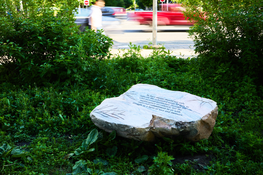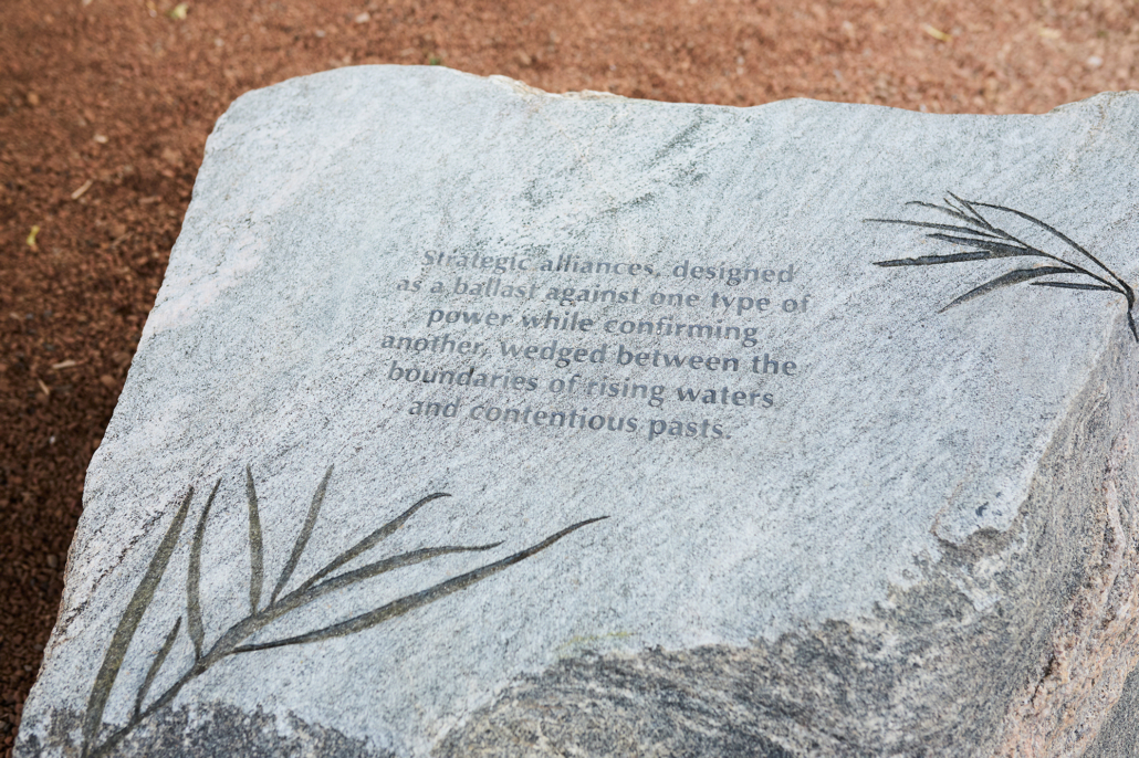 Perspective Alignment is a series of sculptural benches made from Ontario rock and engraved with reflections on recovery in its many forms: the relationship between historical trauma and contemporary social health, the intertwining themes of cultivation and wildness, and the inability of traditional monuments to provoke recovery and healing.