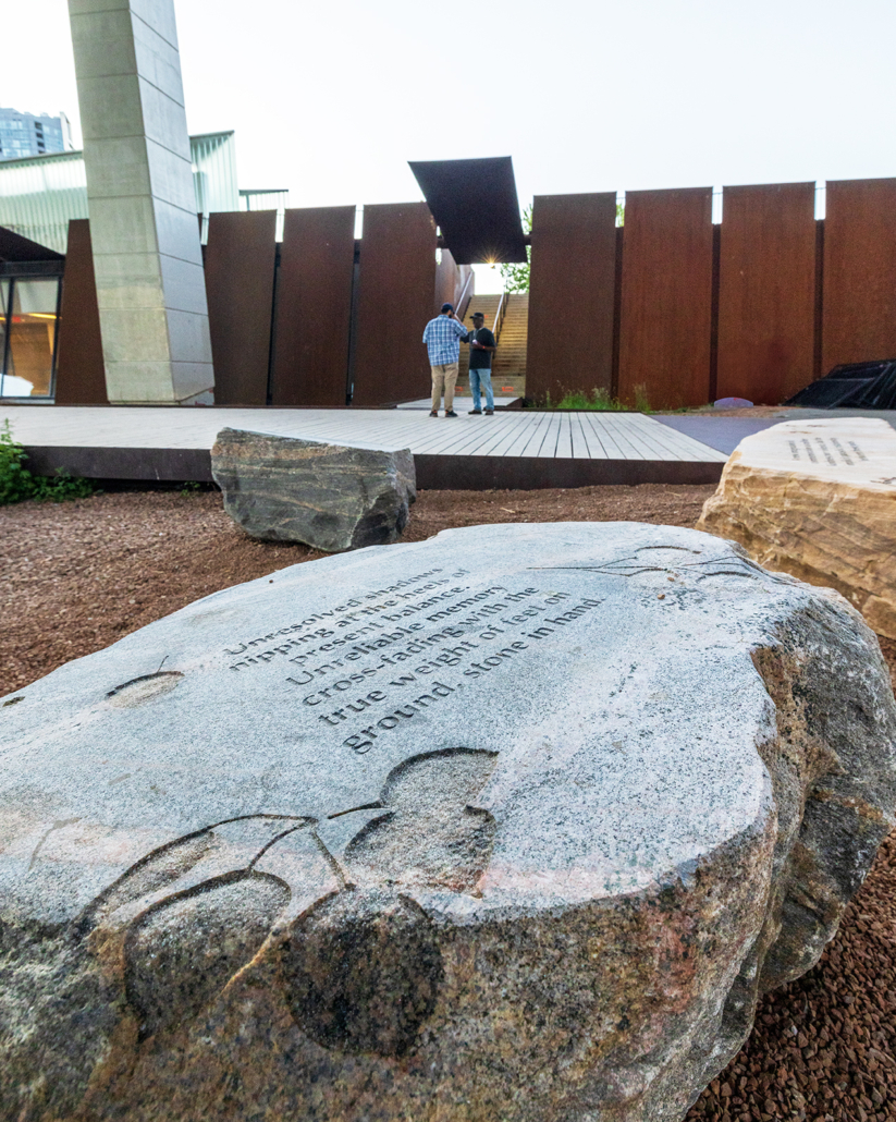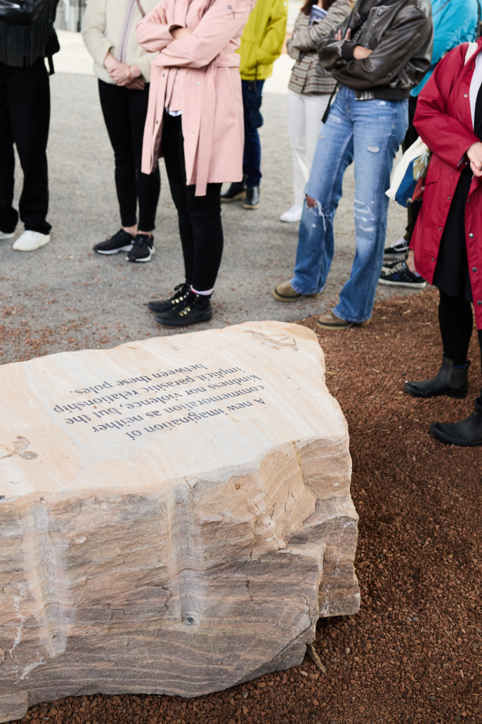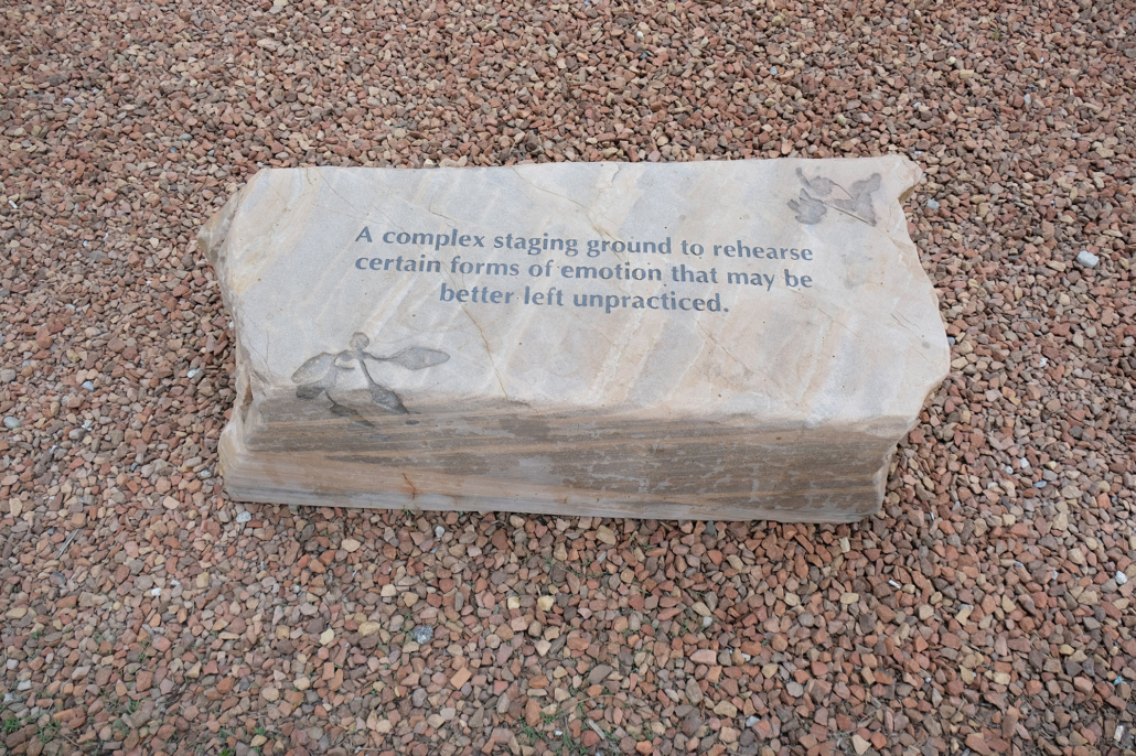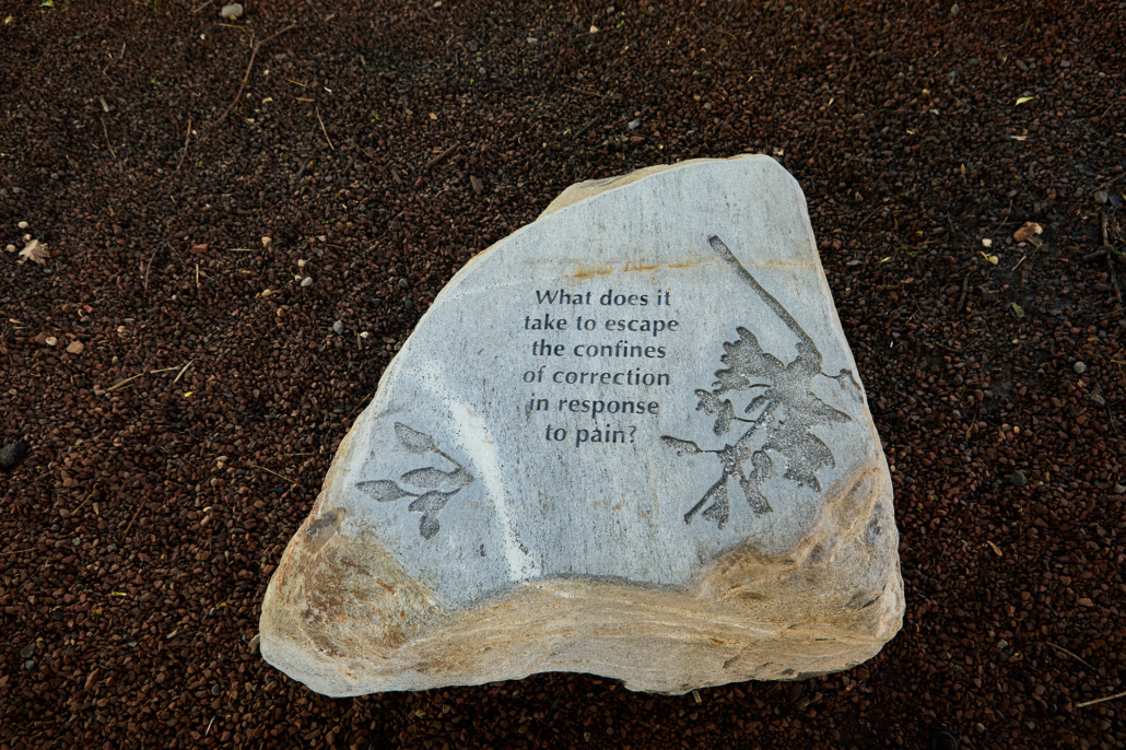 Perspective Alignment is a series of sculptural benches made from Ontario rock and engraved with reflections on recovery in its many forms: the relationship between historical trauma and contemporary social health, the intertwining themes of cultivation and wildness, and the inability of traditional monuments to provoke recovery and healing.