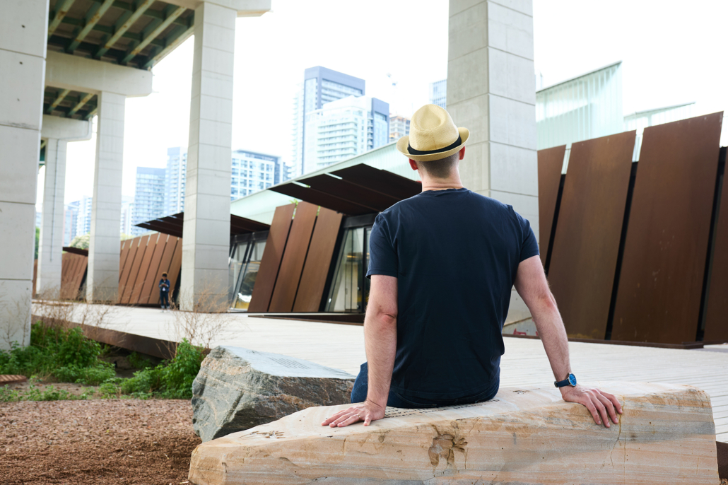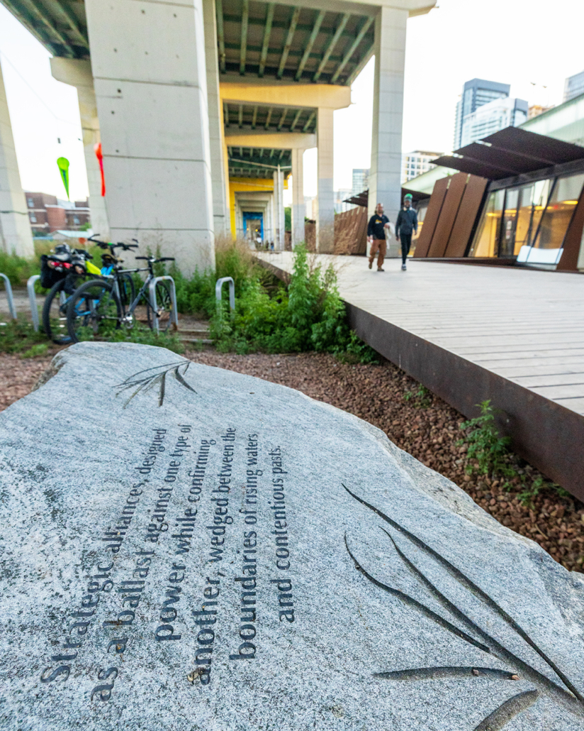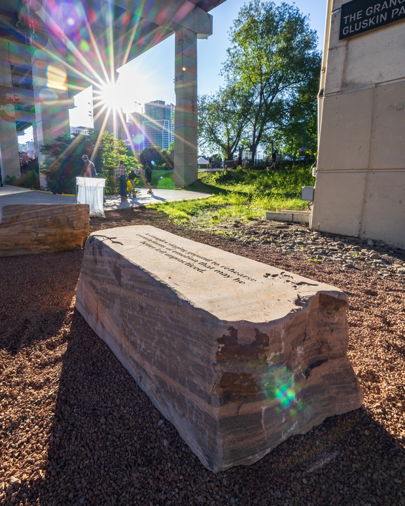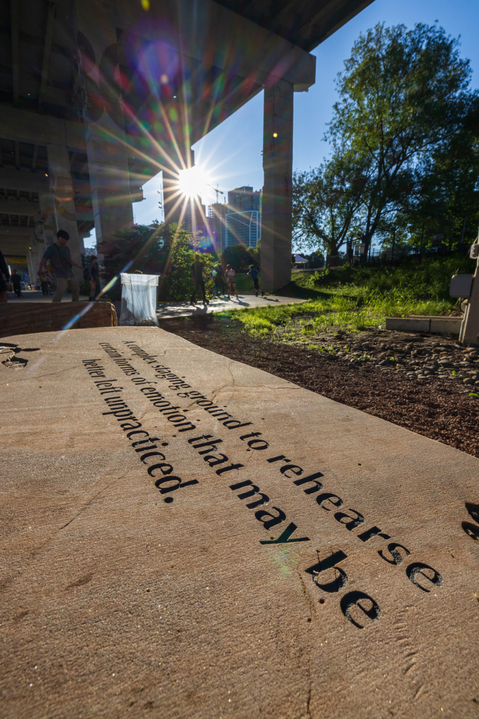 Each stone bench bears its own engraved text and the silhouette of a tree local to the landscape at one time. The texts, taken together, comprise a loose poem, aligning multiple perspectives on recovery from across time: The Bentway’s proximity to Fort York with its colonial and military history, and its many unresolved violences, losses, and transformations; and the ways mental health and well-being are affected by the past, which is always nipping at the heels of present balance.