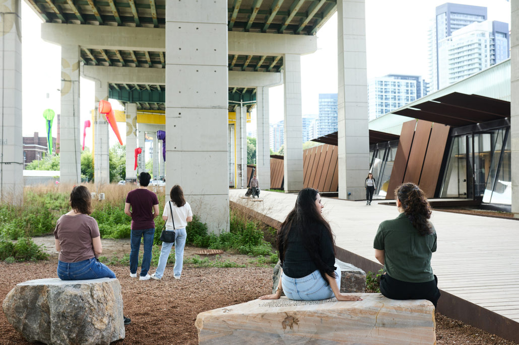 Situated across The Bentway site, my work invites visitors to sit alongside a friend or stranger and reflect on our historical and contemporary collective health and well-being, undertaking the difficult but necessary work of softening our perspectives towards one another through empathy and care. Through collective proximity, and upon the hard weight of the past, there can be the creation of a new kind of living monument, which is the possibilities that are created when people share space and align perspective.