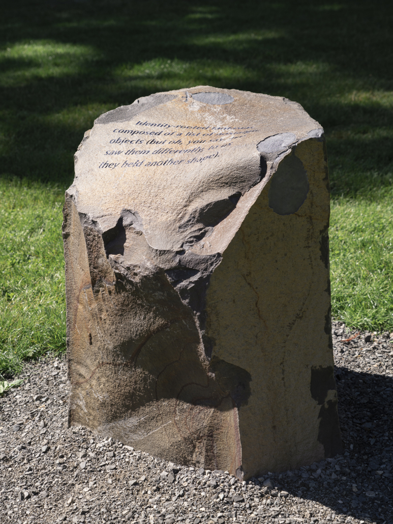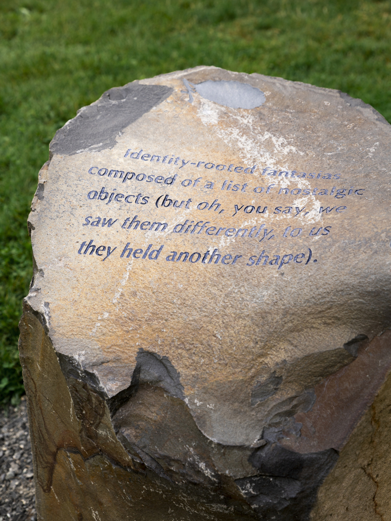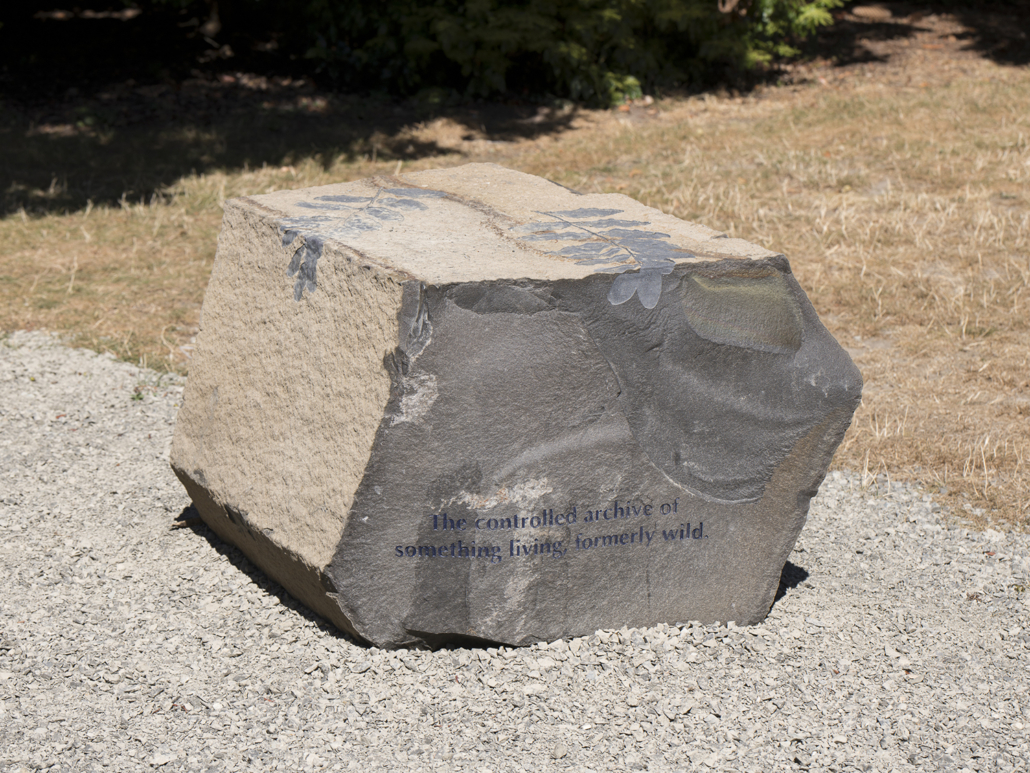 Soft Services, commissioned by Seattle’s Henry Art Gallery, consists of a series of sixteen stone benches: fourteen placed throughout Seattle’s Volunteer Park, with two additional sculptures residing outside the Henry itself. Each bench is engraved with its own inscription—artist-written text that both stands alone and creates a larger meaning across the series of seating—and a silhouetted image applied in light-responsive pigment, which allows the image to shift slightly based on the time of day, weather conditions, and sight lines. The project examines themes of cultivation and wildness, the laws we impose to control human bodies, hierarchy and proximity, and stones as memorials, boundaries, and legislative markers.