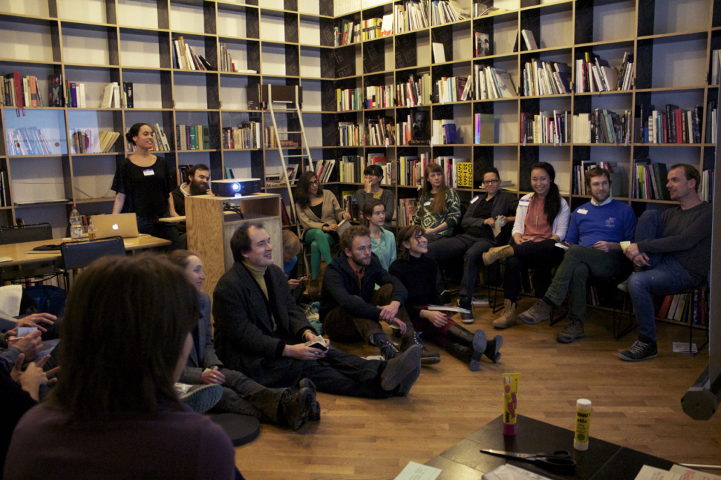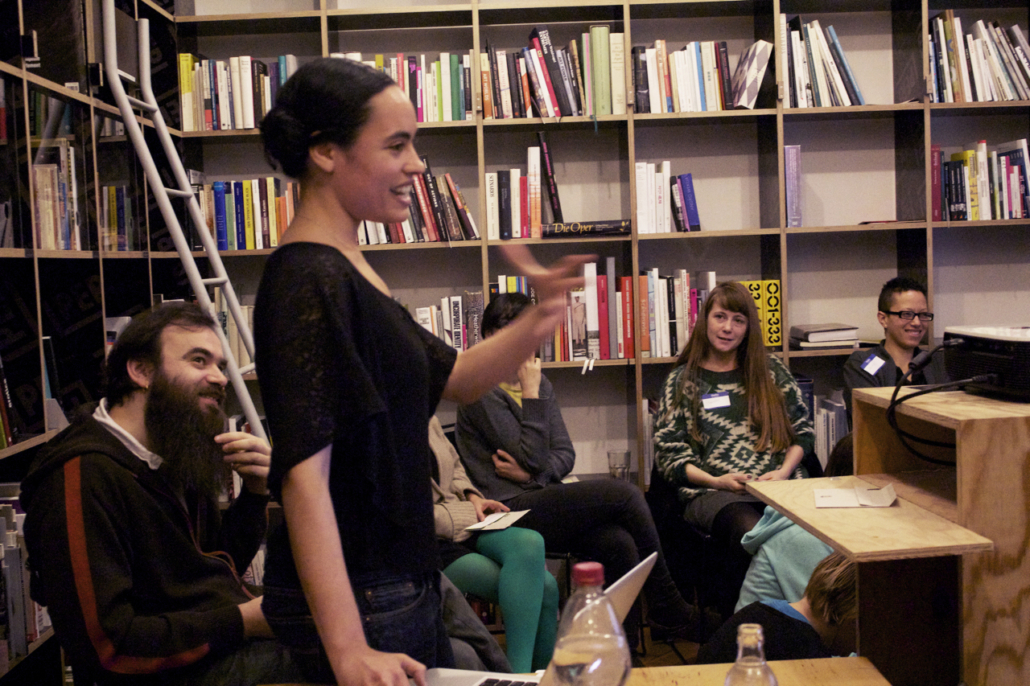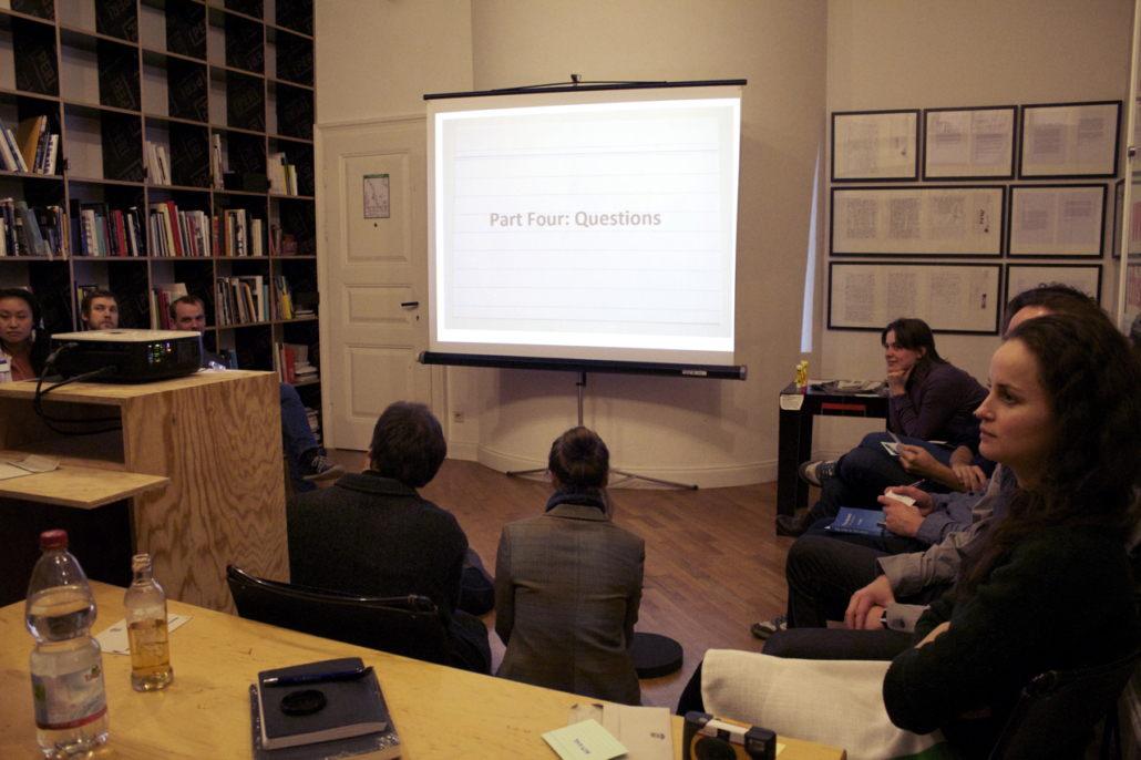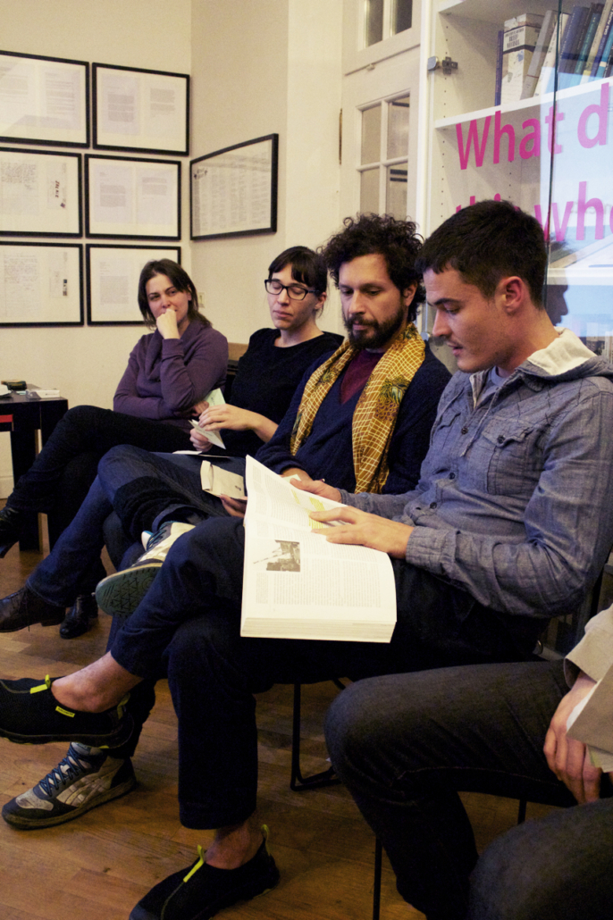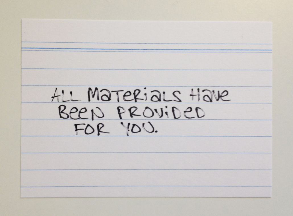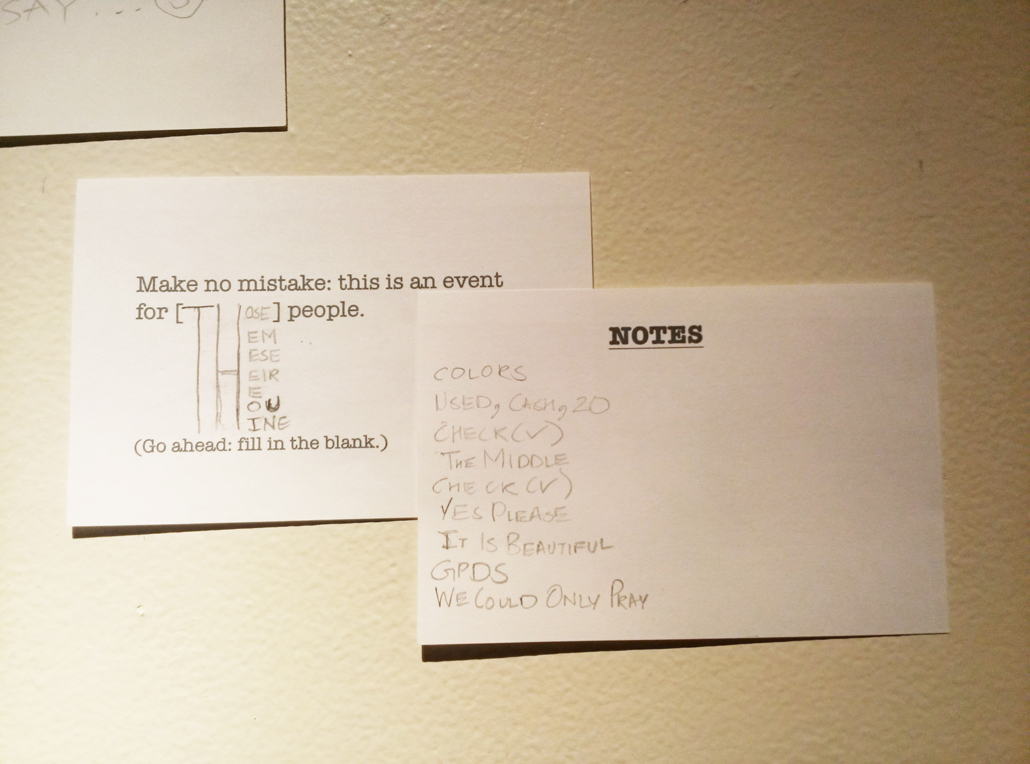 This slideshow is here so we both know what to do was a presentation/performance presented at Akademie Schloss Solitude in February 2013. The slideshow (and the speech given by the artist in response to the slideshow) served as a series of cues that triggered various actions by the audience, which were assigned on index cards. Actions included: if you hear the word “performance,” please stand up; take photographs; if you see more than three people standing, applaud; and other simple tasks. Four audience members were also cued at various points to read from provided texts: Adrian Piper’s essay in Claire Bishop’s Participation, Lucy Lippard’s The Lure of the Local, Peter Brook’s The Empty Space, and Augusto Boal’s Games for Actors and Non-Actors. This process of reading cued by images and/or actions was a first foray into live footnoting.