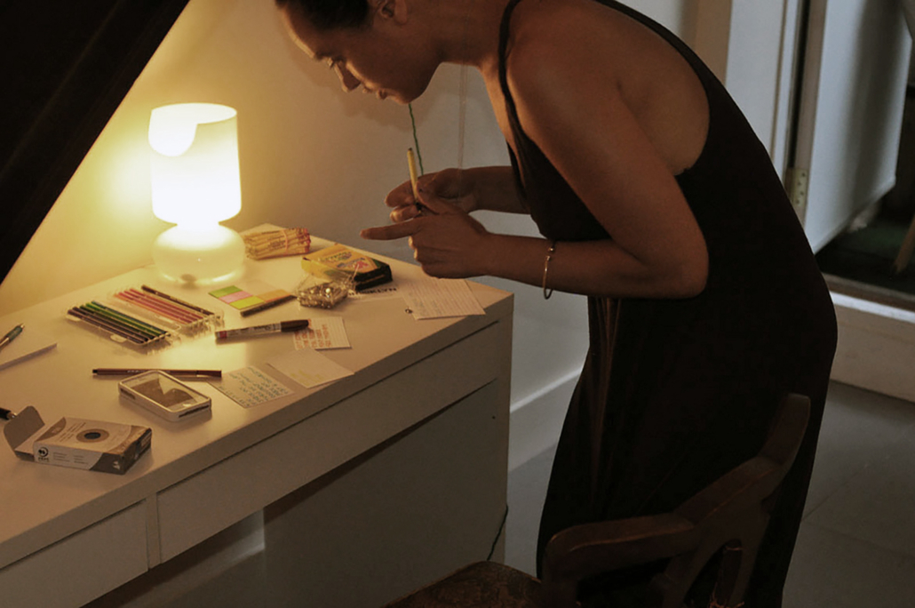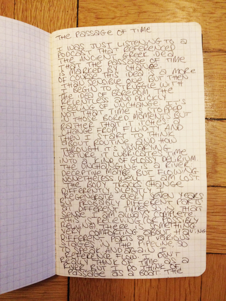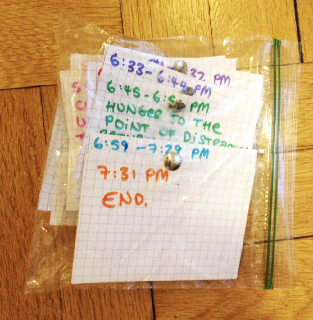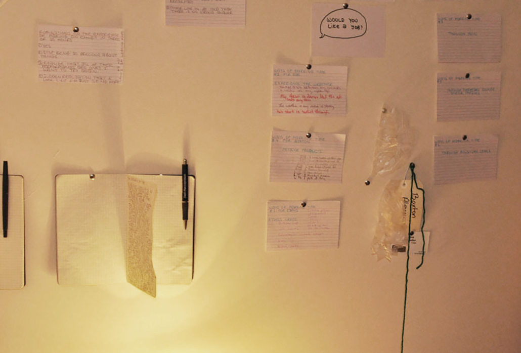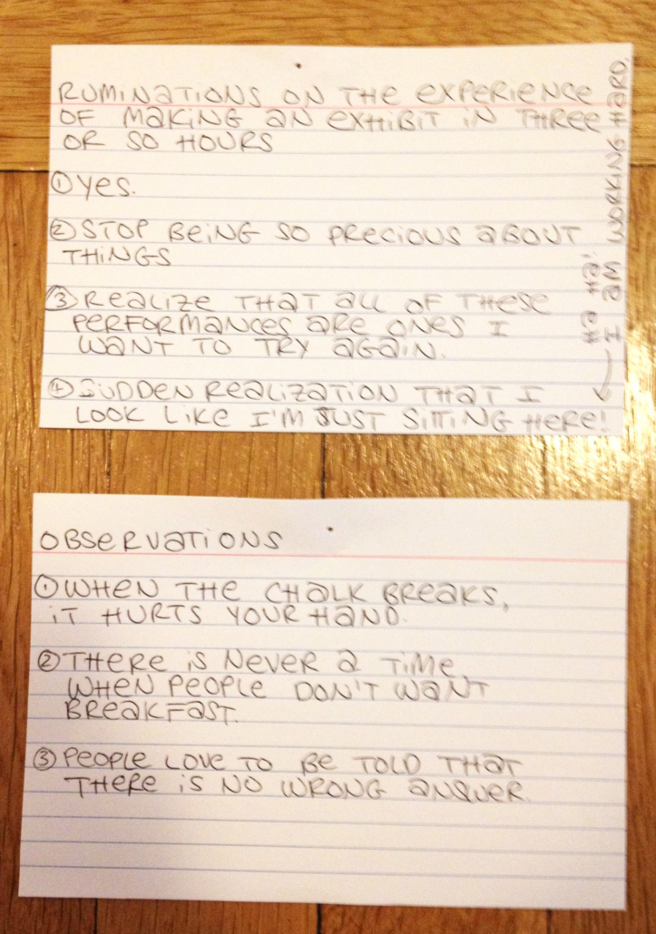 Archiving the Now results in three simultaneous timelines presented on index cards, alongside any residual results from either tasks performed by audience members, or the artist’s own observations.