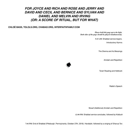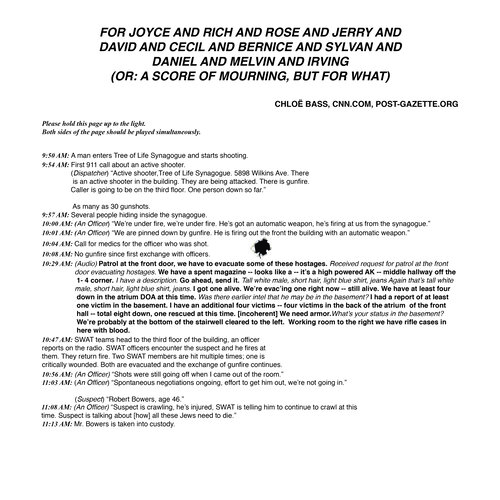For Joyce and Richard and Rose and Jerry and David and Cecil and Bernice and Sylvan and Daniel and Melvin and Irving is a sound score of the 2018 Pittsburgh Synagogue Shooting, using available transcripts released by CNN (front) set against the timeline of a standard Saturday morning Shabbat service (back). This work was produced for Ear | Wave | Event Issue 4.