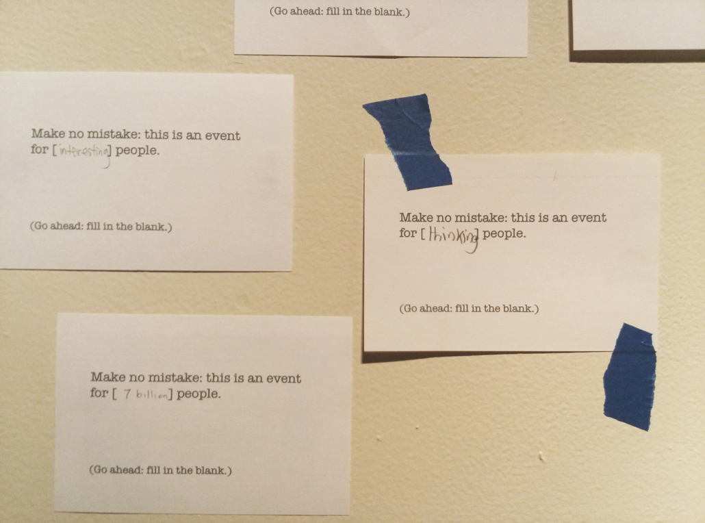 This slideshow is here was created to question the format of the artist’s talk, which generally encourages passive engagement by an audience sitting in the dark. My work is best experienced as it is lived, including in presentation format. Bringing the audience to the light (and “to the stage”) allowed all listeners to have the experience of being part of a piece as well as learning about one.