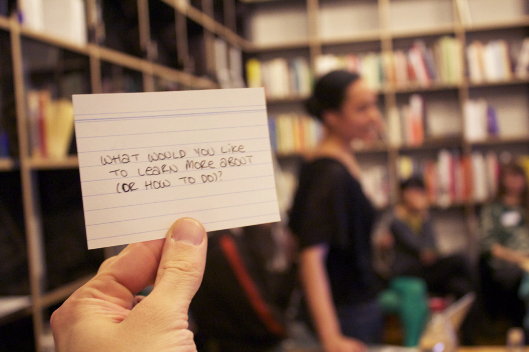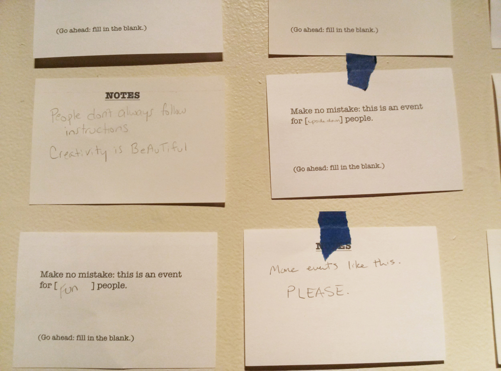 A future you can touch was a participatory installation created for the Anti-Auto Show at the Contemporary Art Institute of Detroit, curated by Spread Art. The work encouraged gallery-goers to interact with other pieces in the exhibit as if they were at a car show. Each index card contained either a question or a mildly insinuating suggestion; some cards allowed for direct user feedback and response in writing.
