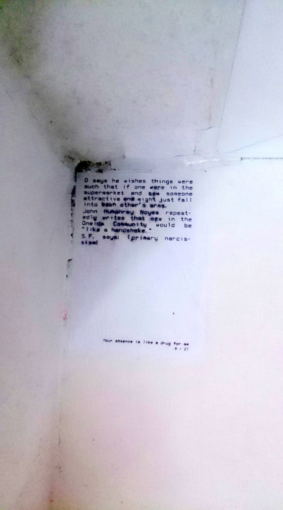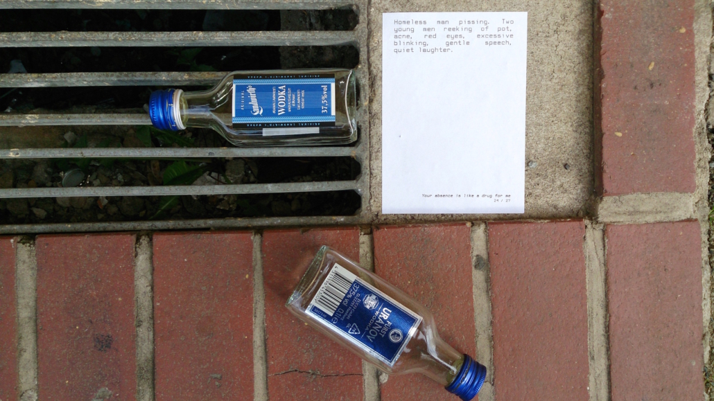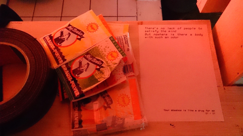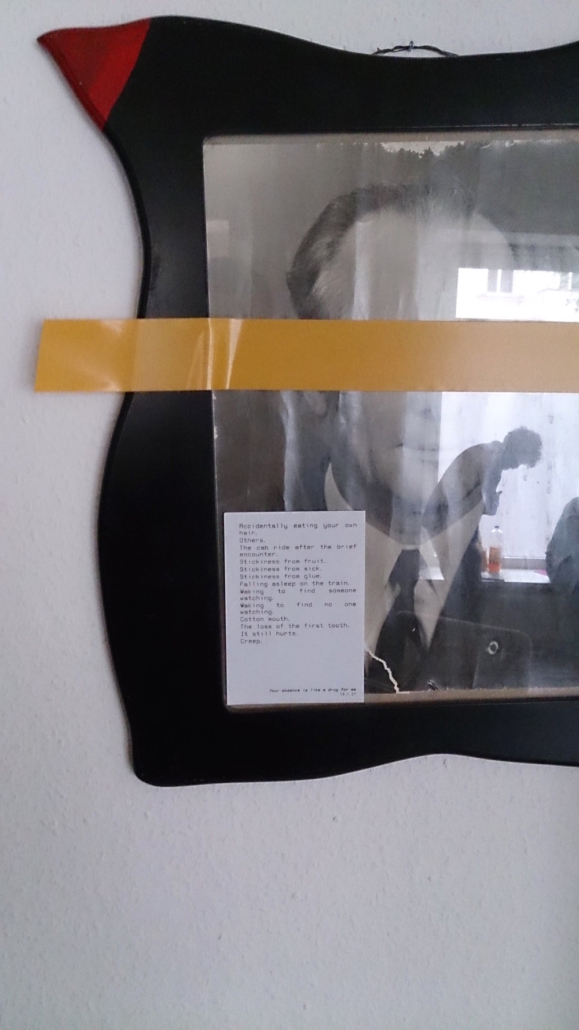 A collaboration between Chloë Bass and Bill Dietz, Your absence is a like a drug for me was created for the final Month of Performance Art-Berlin. The project appeared at and around Berlin’s Liebig 12, for Sounding the Alarm: Theories of the Anti-Sight I, curated by Panoply Performance Laboratory.