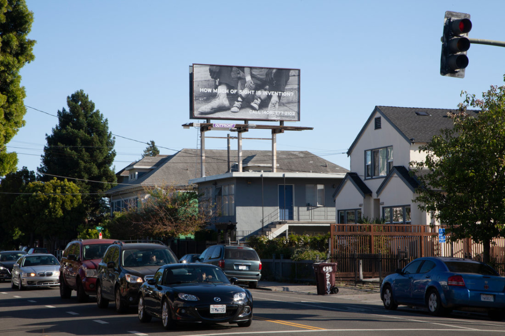I made you in my image is a billboard and call-in audio piece produced for Montalvo Arts Center’s 2020 exhibit lone some. The work draws from the textual style and archival images used in Wayfinding, which was commissioned by the Studio Museum in Harlem in 2019. The image is an “excerpt” of a family photograph found in the New York Public Library’s Media Collection, cropped to show only a gesture of holding. The text is a fourth suggested question after Wayfinding’s three central focus questions: How much of care is patience? How much of life is coping? How much of love is attention? All four of these questions, and in particular How much of sight is invention? ask viewers to consider the relationship between people and cities as familial: the ways we are and are not able to be close to, or truly seen by, those we love, and the moments in which family love can leave us feeling more isolated or alone than we might imagine, from the outside, would be the emotional result of family structure. The billboard was on view at 6315 Shattuck Avenue in Oakland, CA, through July 31st, 2020.
