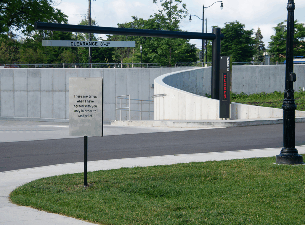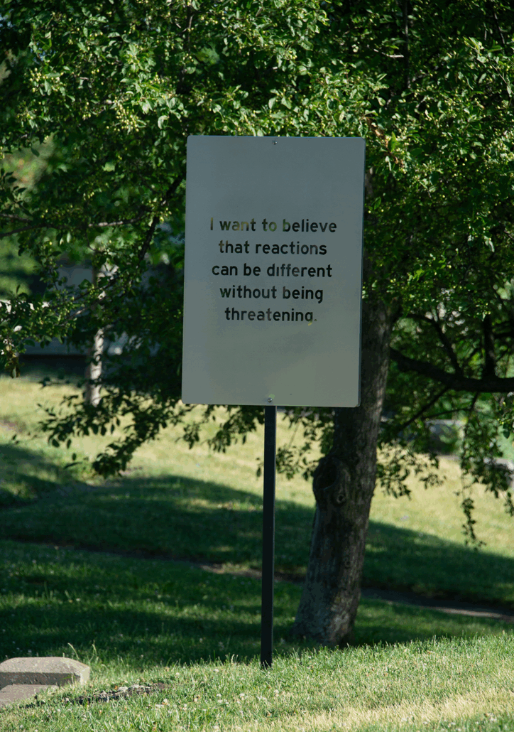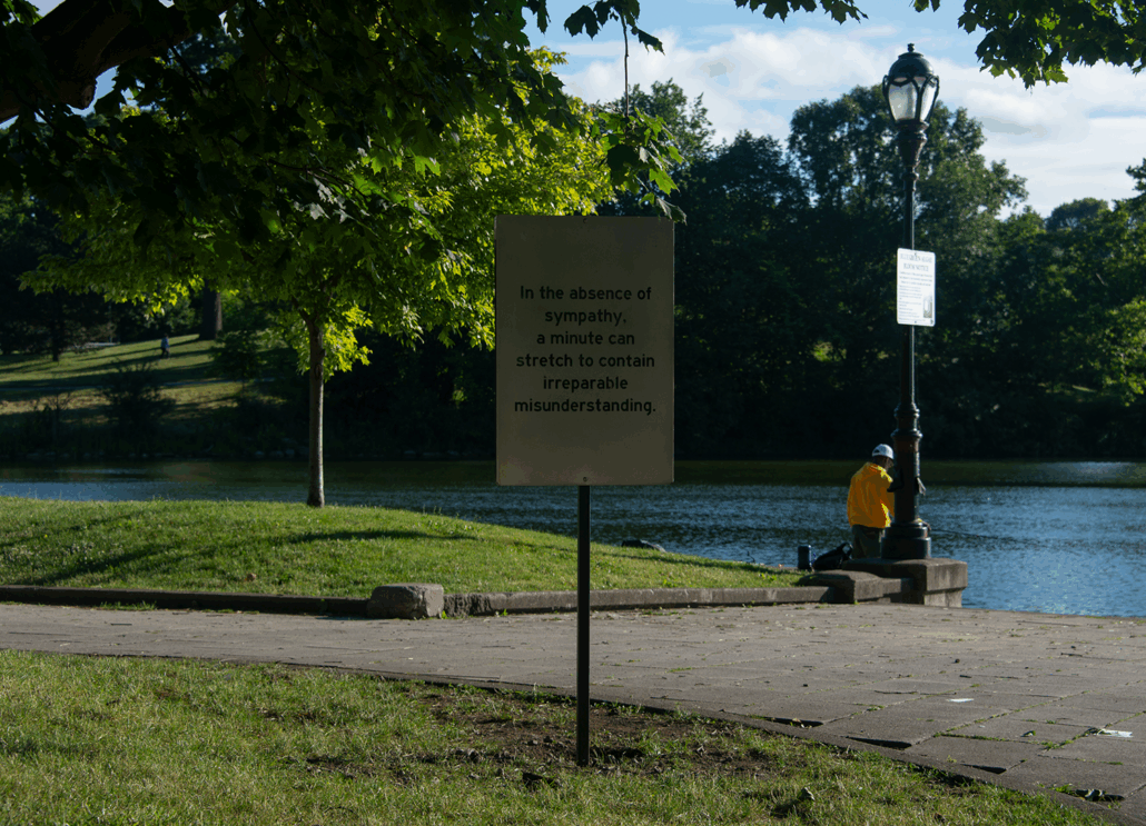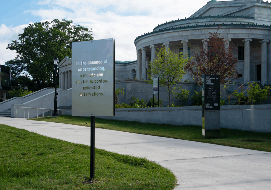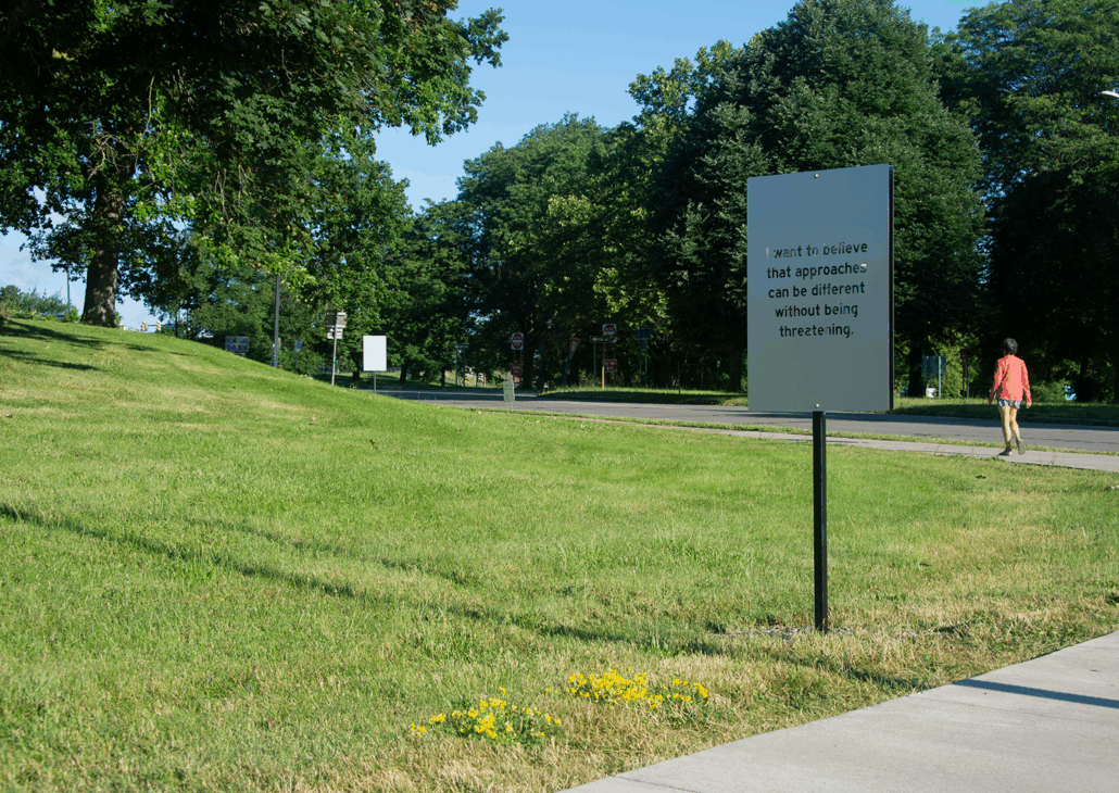 The fourth and final iteration of Wayfinding is a meditative installation of forty-eight sculptural signs placed throughout the grounds of Delaware Park and the Buffalo AKG campus. Through a combination of evocative and lyrical prose and archival images, the sculptures encourage moments of private reflection in public space.