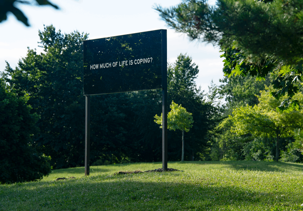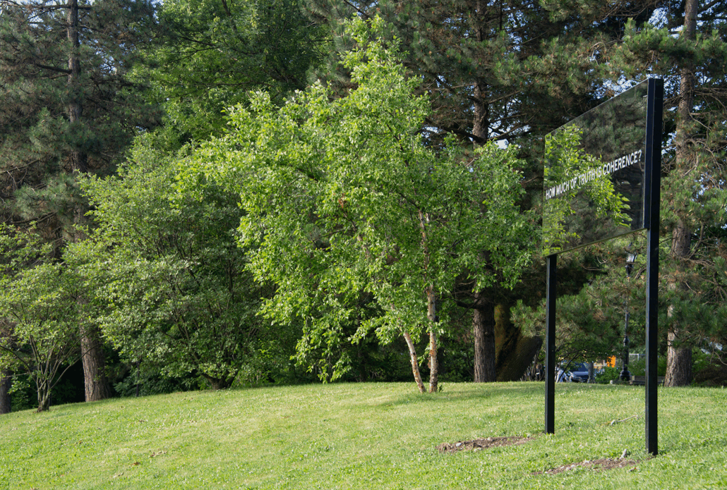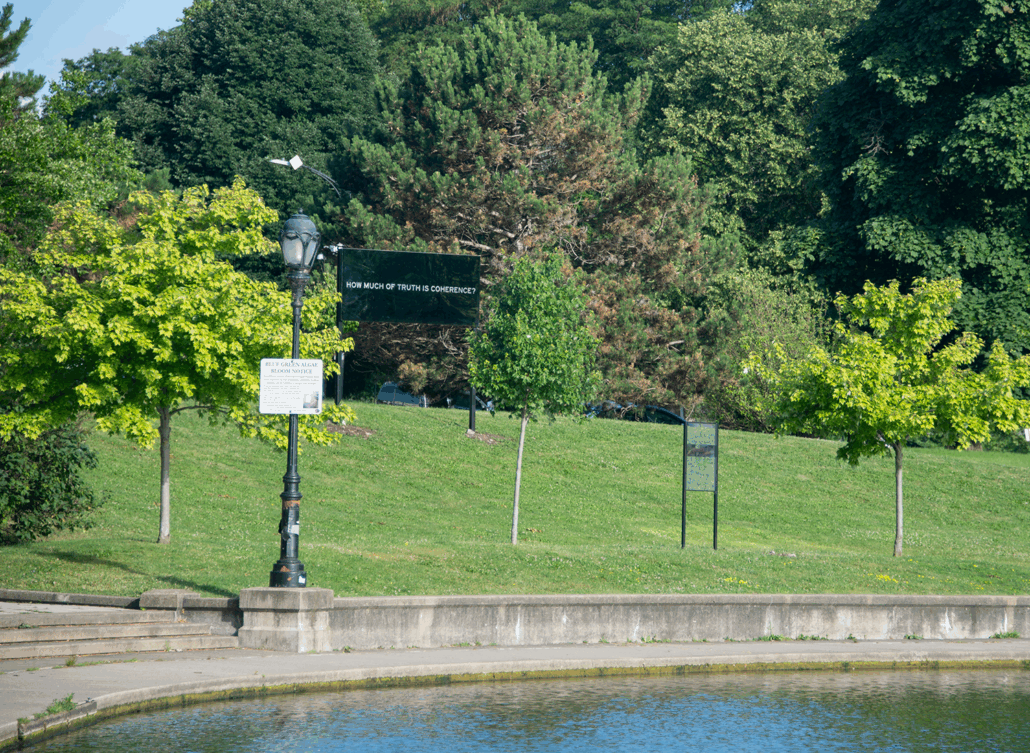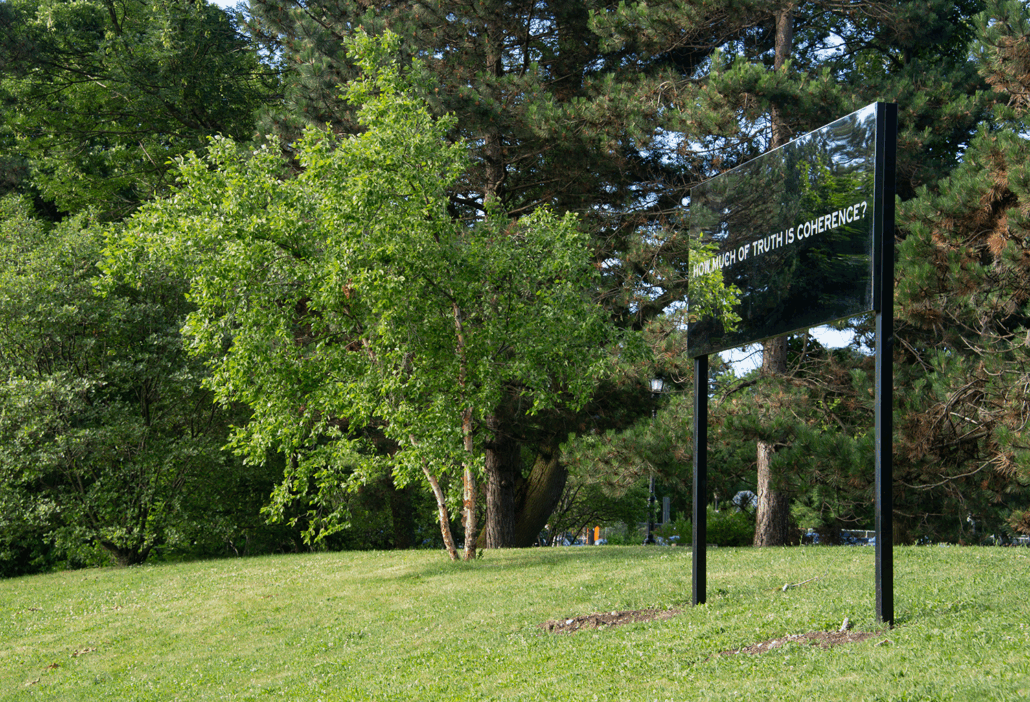 Each iteration grew around a central question. For this final installation, I added a billboard-sized prompt – How much of truth is coherence? – to the previous five questions that organized the project: How much of love is attention? How much of care is patience? How much of life is coping? How much of belief is encounter? How much of hope is forgetting?