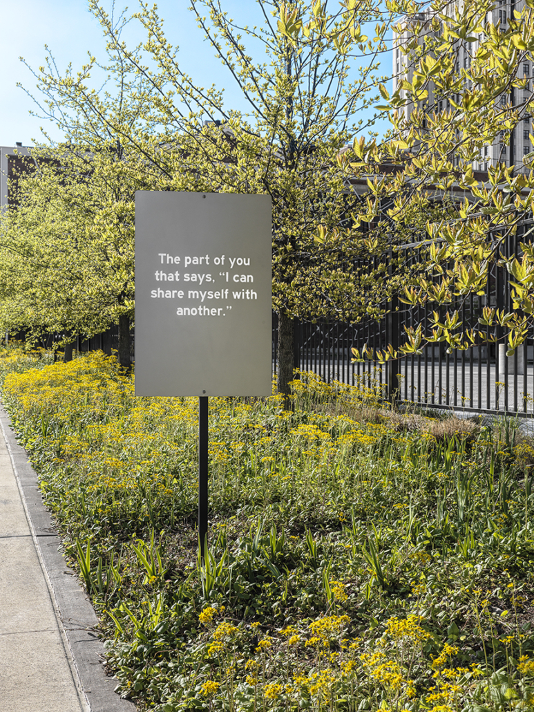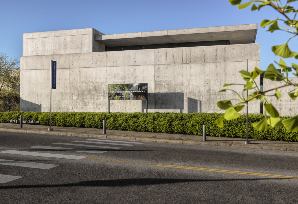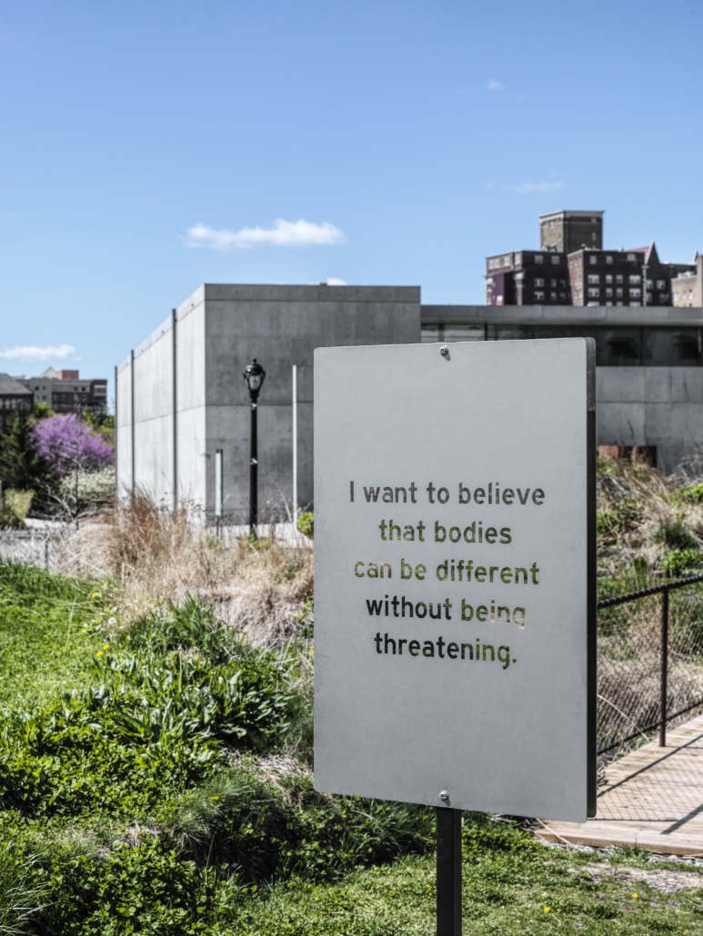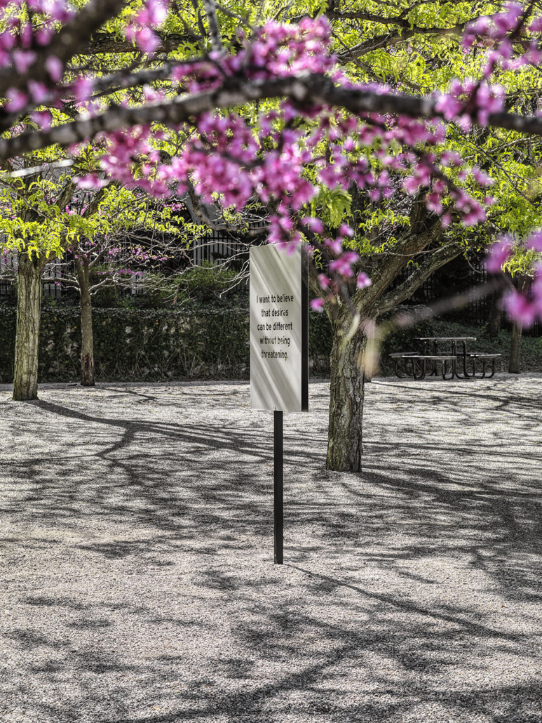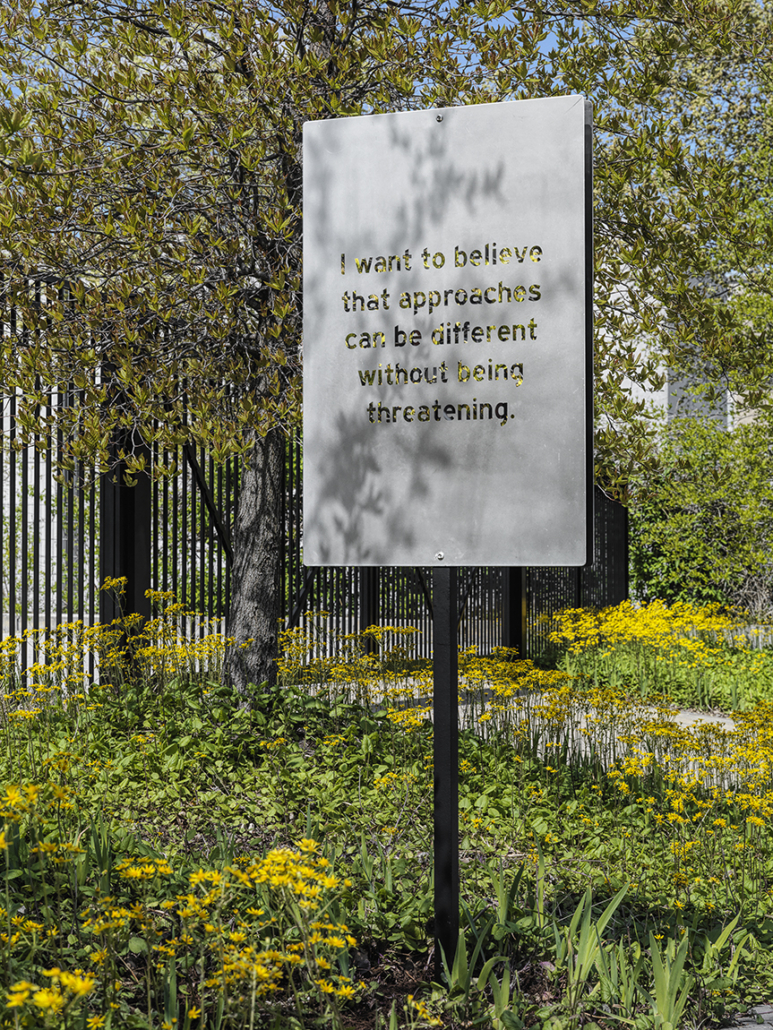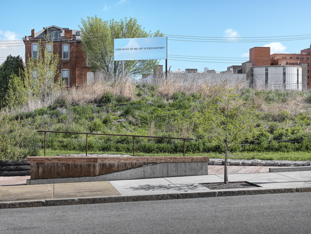 The works in the exhibition were organized into four sections. Each is anchored by a billboard posing a question that explores human emotions ranging from compassion and desire to anxiety and loss. Like Phase 1, Phase 2 also includes a site-specific audio artwork narrated by the artist and local collaborators.The audio artwork draws from several sources: quotes from the City of St. Louis’s Mow to Own Program (a program where citizens can acquire properties adjacent to their own by caring for the site for two years), Google and Yelp reviews of the Pulitzer, reports on aging and disorientation from the National Institutes of Health, landscape architecture teaching guides, and the artist’s personal narrative. It also incorporates many of the phrases written on the sculptures. The audio guide is performed by me, artist Damon Davis; poet, storyteller, and podcaster Cheeraz Gormon; and theater artist Ron Himes.