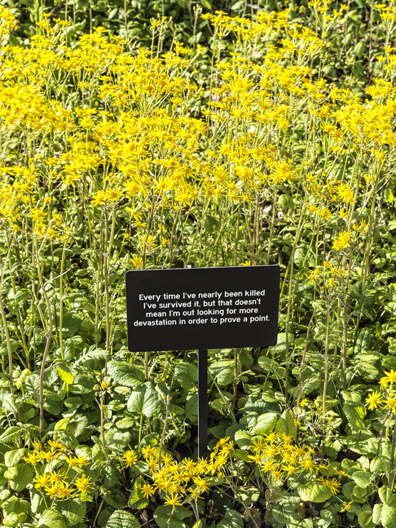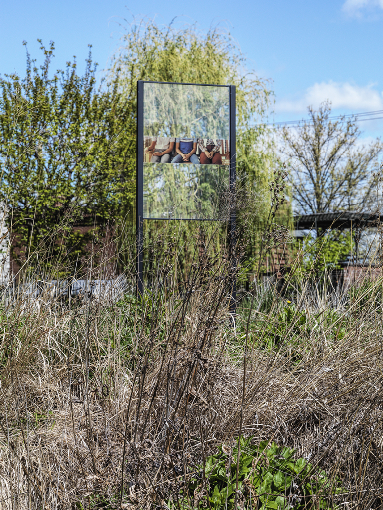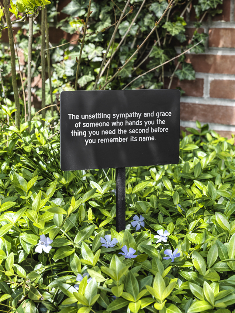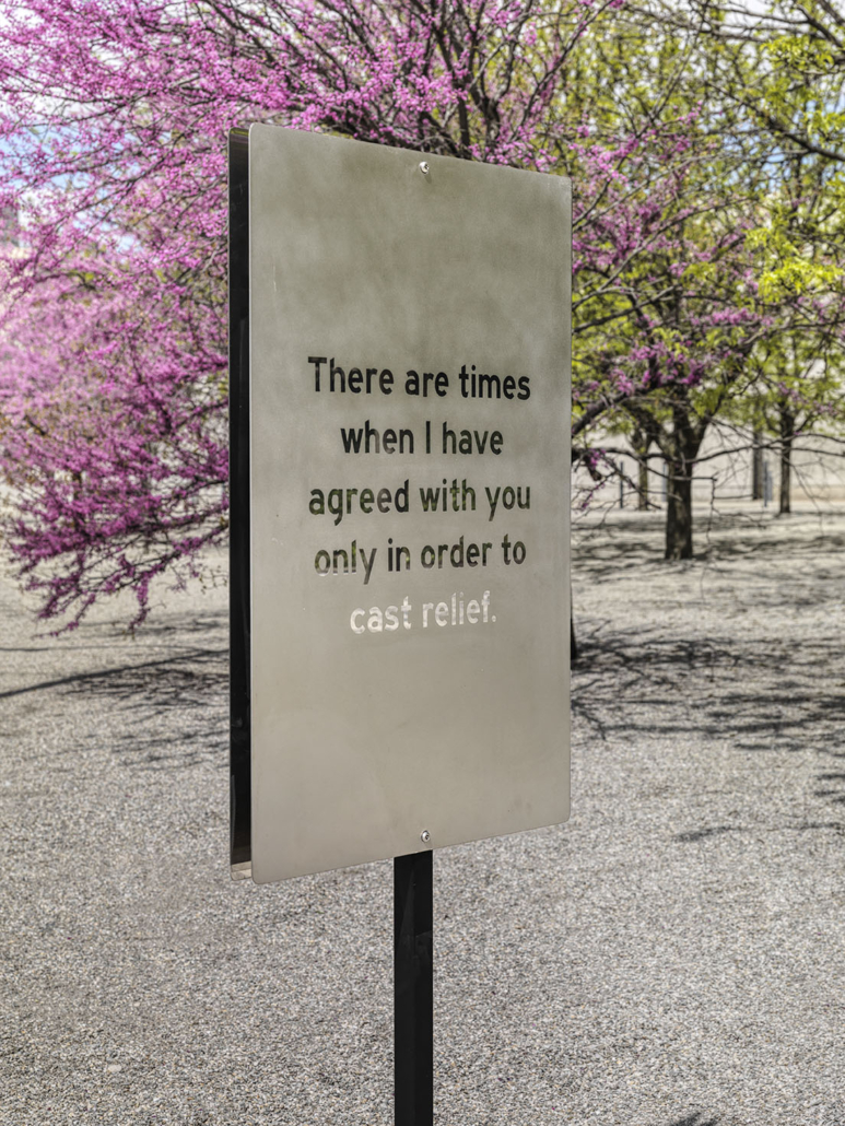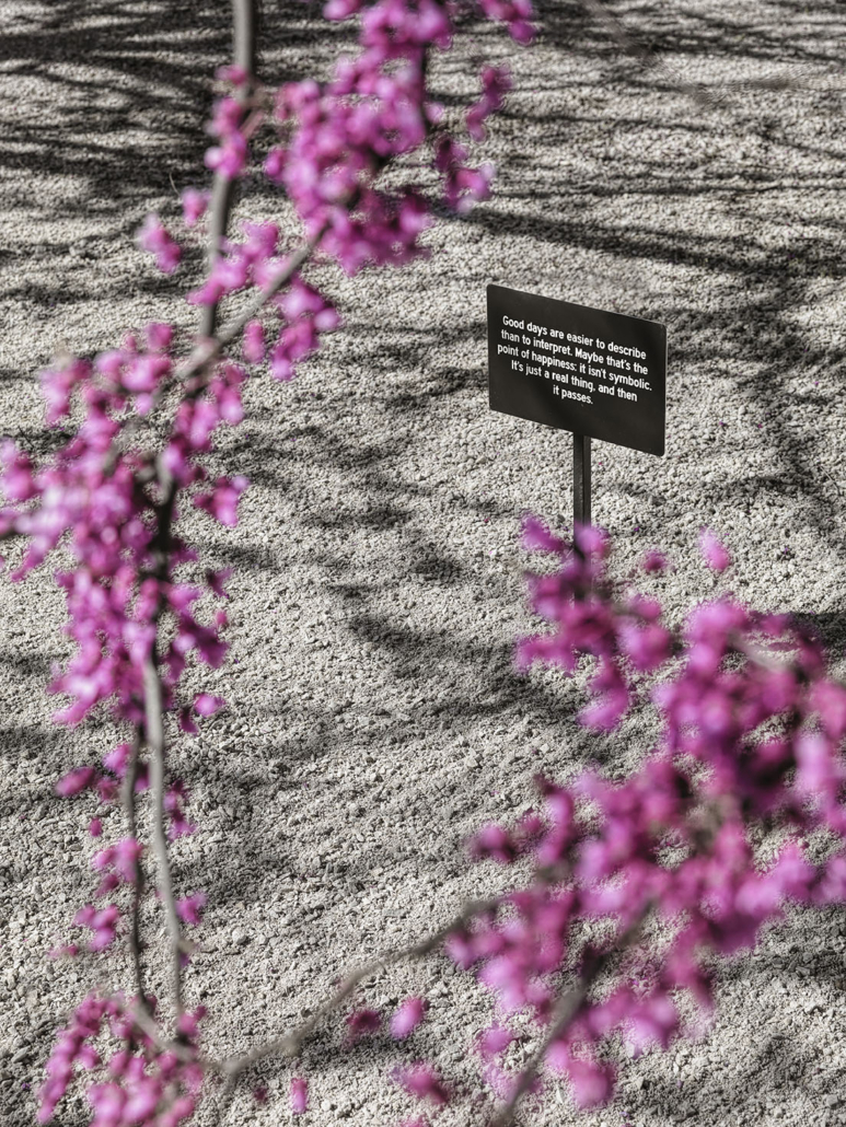 The works in the exhibition were organized into four sections. Each is anchored by a billboard posing a question that explores human emotions ranging from compassion and desire to anxiety and loss. Like Phase 1, Phase 2 also includes a site-specific audio artwork narrated by the artist and local collaborators.The audio artwork draws from several sources: quotes from the City of St. Louis’s Mow to Own Program (a program where citizens can acquire properties adjacent to their own by caring for the site for two years), Google and Yelp reviews of the Pulitzer, reports on aging and disorientation from the National Institutes of Health, landscape architecture teaching guides, and the artist’s personal narrative. It also incorporates many of the phrases written on the sculptures. The audio guide is performed by me, artist Damon Davis; poet, storyteller, and podcaster Cheeraz Gormon; and theater artist Ron Himes.