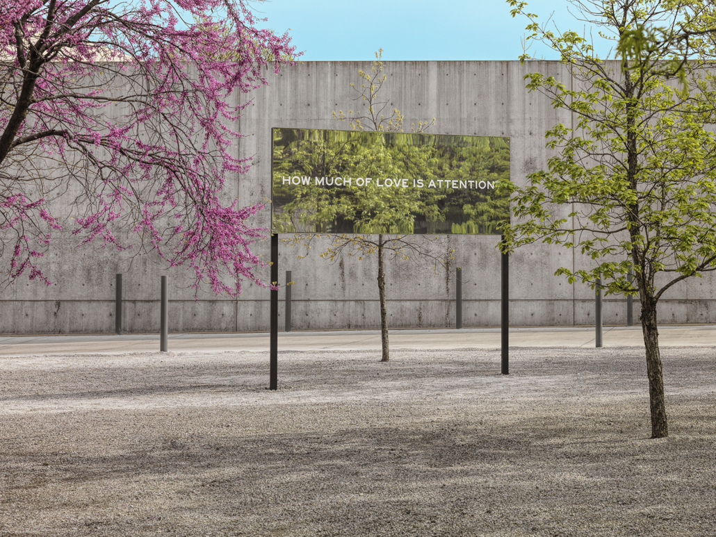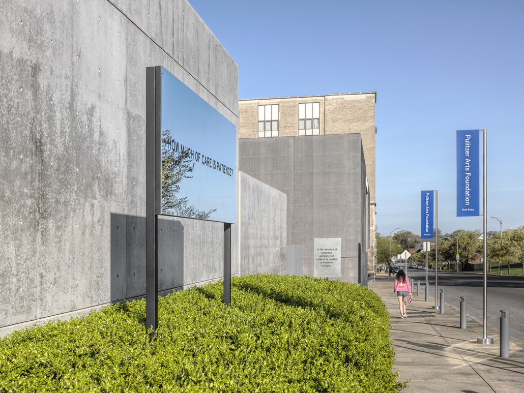 Chloë Bass: Wayfinding, originally commissioned by The Studio Museum in Harlem, opened in its second iteration at the Pulitzer Arts Foundation in St. Louis. The second phase expanded the number of site-specific sculptures from twenty-four to thirty-two, all gesturing toward the structural and visual vernacular of public wayfinding signage. Phase two begins with and revolves around four central questions, poetically penned by the artist and featured throughout the park in billboard form: How much of care is patience? How much of life is coping? How much of love is attention? How much of belief is encounter?
