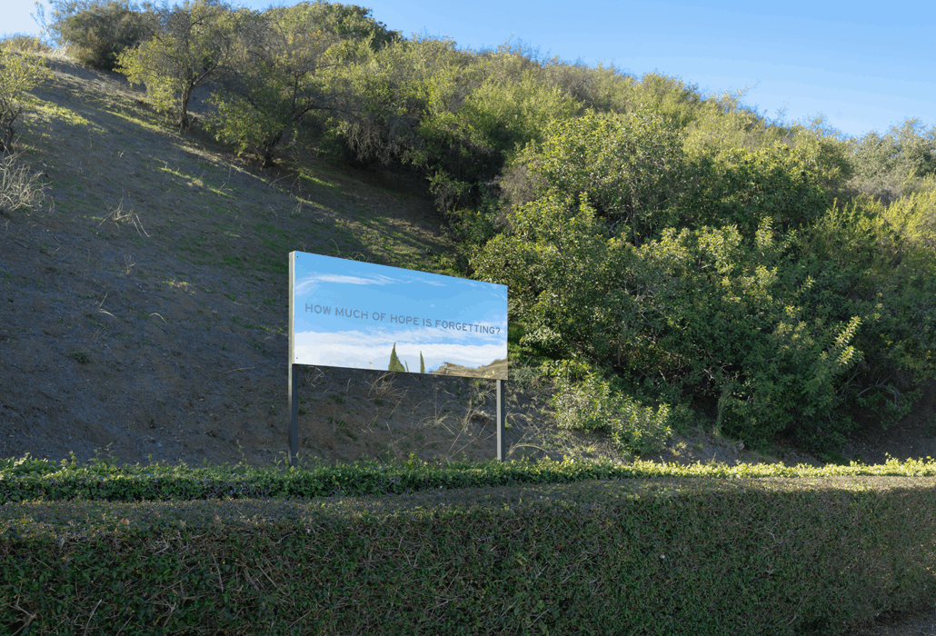 The third iteration of Wayfinding was presented by the Skirball Cultural Center as its first-ever outdoor exhibition. The Skirball also commissioned a new set of eight sculptures (expanding the project from thirty-two sculptures to forty), including the billboard “How much of hope is forgetting?”