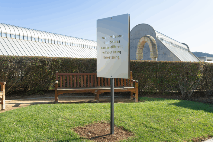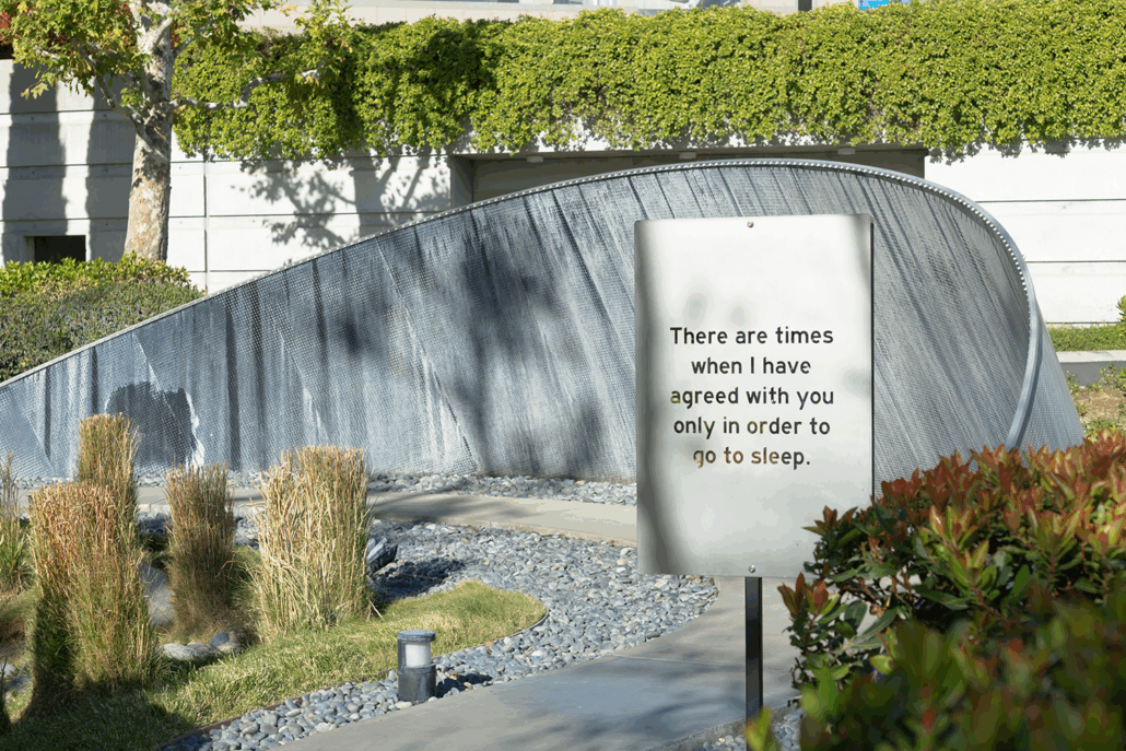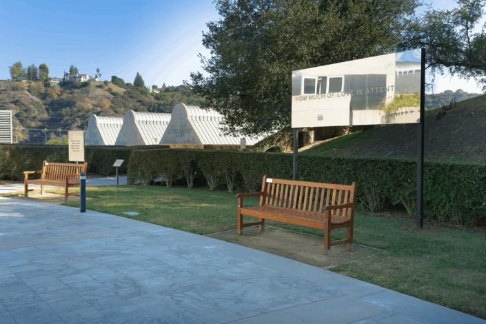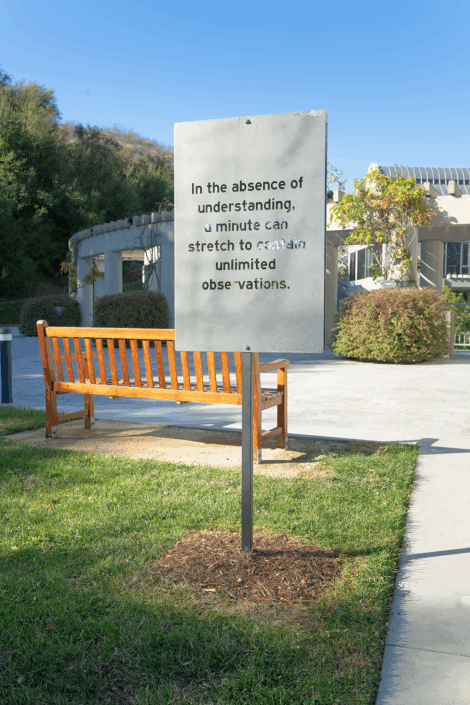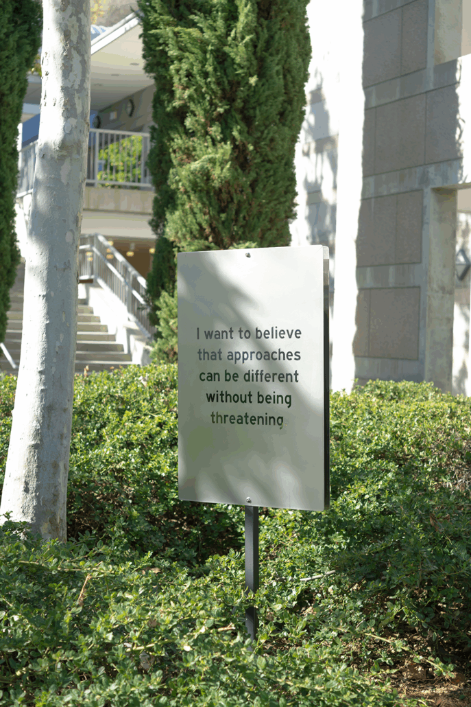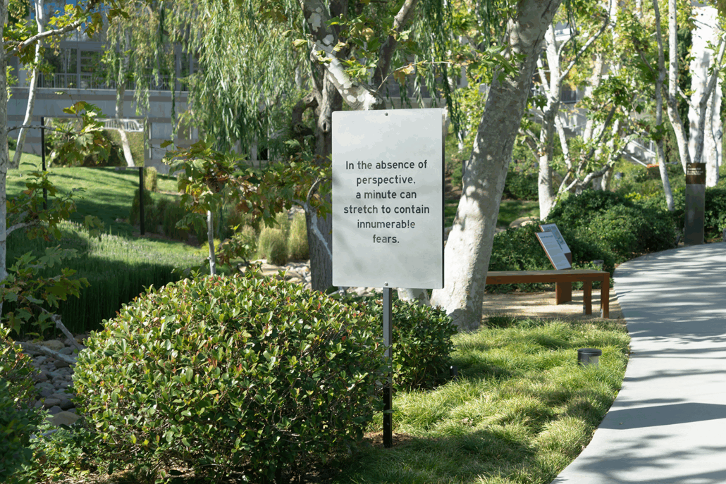 The works in the exhibition were organized into five sections. Each is anchored by a billboard posing a question that explores human emotions ranging from compassion and desire to anxiety and loss. Like Phases 1 and 2, Phase 3 also includes a site-specific audio artwork narrated by the artist and local collaborators (Kyra Jones, Mollie Eisenberg, and Jake Lawler). The audio guide draws from several sources: landscape architecture teaching guides, quotes from the Los Angeles Department of Water and Power, United Nations reports on water use and restriction in the West Bank, Google and Yelp reviews of the Skirball Cultural Center, reports from the National Institutes of Health on aging and disorientation, as well as on the impact of GPS use on long-term navigation, and personal narrative. It also incorporates many, although not all, of the phrases that I installed on the signs around the Skirball’s campus.