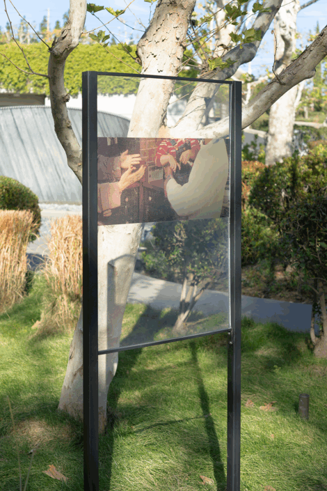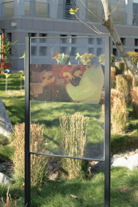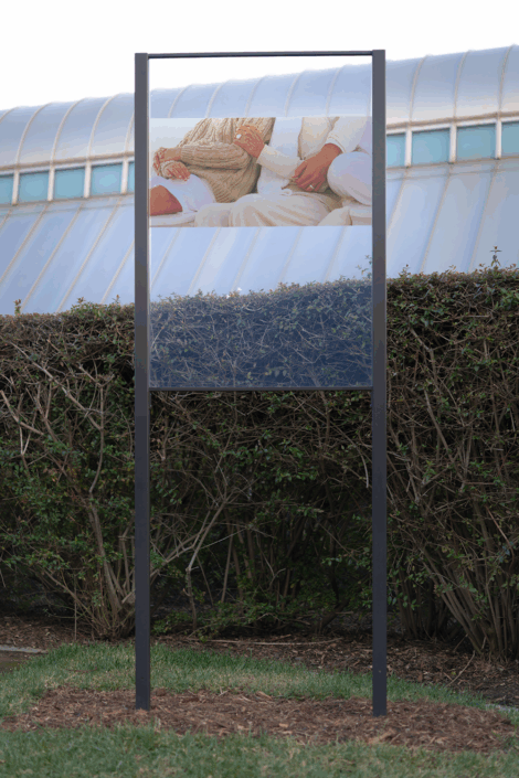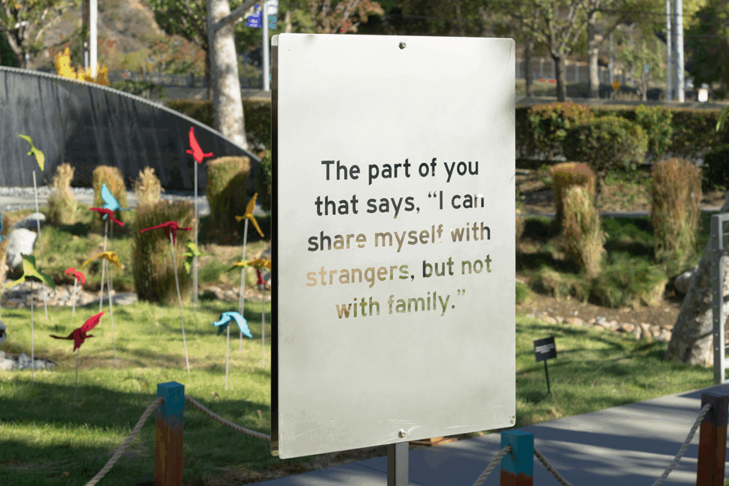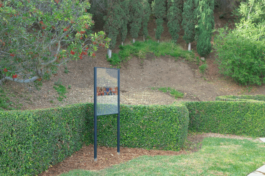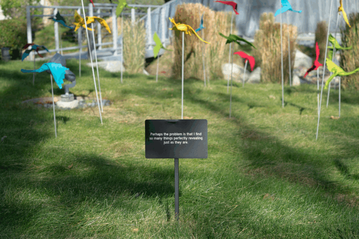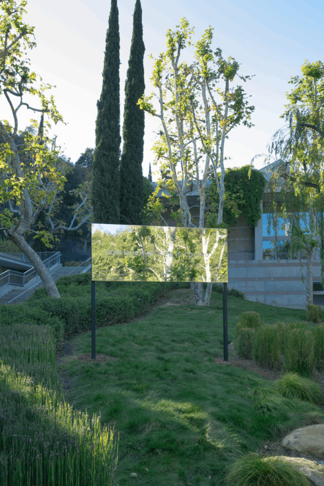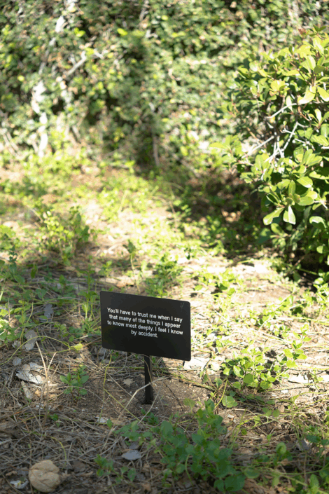 The works in the exhibition were organized into five sections. Each is anchored by a billboard posing a question that explores human emotions ranging from compassion and desire to anxiety and loss. Like Phases 1 and 2, Phase 3 also includes a site-specific audio artwork narrated by the artist and local collaborators (Kyra Jones, Mollie Eisenberg, and Jake Lawler). The audio guide draws from several sources: landscape architecture teaching guides, quotes from the Los Angeles Department of Water and Power, United Nations reports on water use and restriction in the West Bank, Google and Yelp reviews of the Skirball Cultural Center, reports from the National Institutes of Health on aging and disorientation, as well as on the impact of GPS use on long-term navigation, and personal narrative. It also incorporates many, although not all, of the phrases that I installed on the signs around the Skirball’s campus.